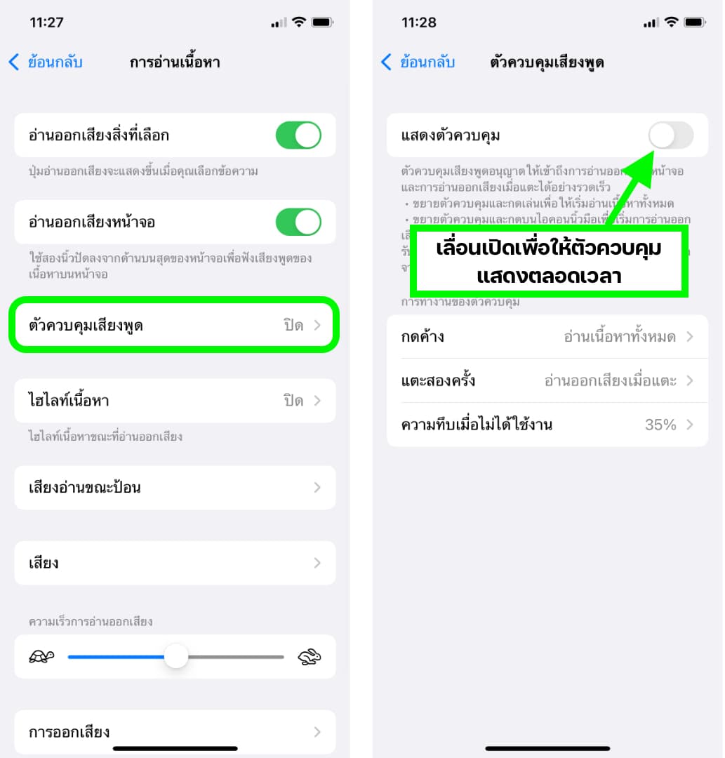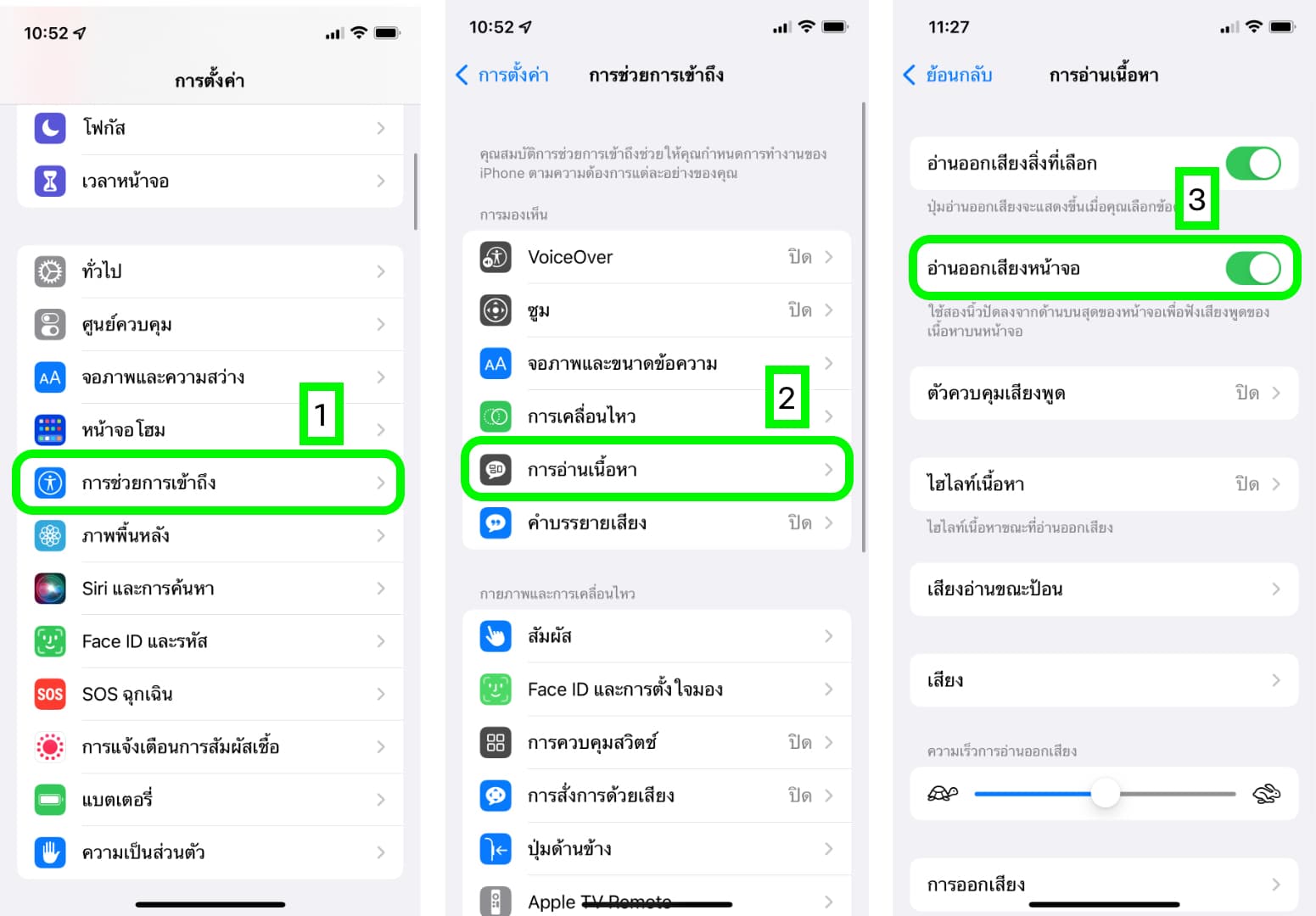 ไปที่การตั้งค่า > การช่วยการเข้าถึง > การอ่านเนื้อหา > เลื่อนเปิด “อ่านออกเสียงหน้าจอ”