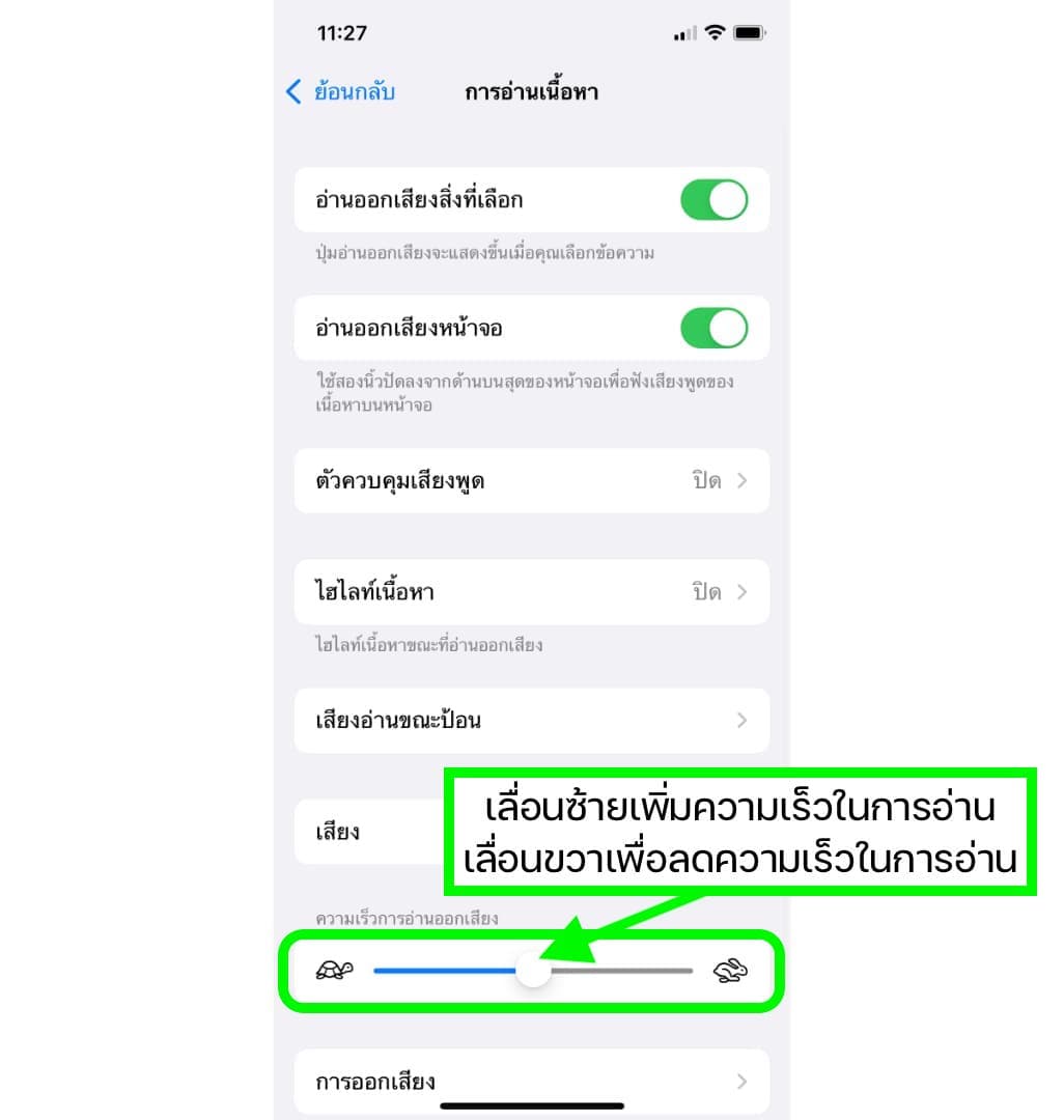 ในหน้าตั้งค่าการอ่านเนื้อหา เราจะเห็นคำว่า “ความเร็วการอ่านออกเสียง” ให้เลือกปรับความเร็วตามที่ชอบ ถ้าเลื่อนซ้ายไปทางน้องเต่าจะอ่านช้าลง ถ้าเลื่อนขวาไปทางน้องกระต่ายก็จะอ่านเร็วขึ้น