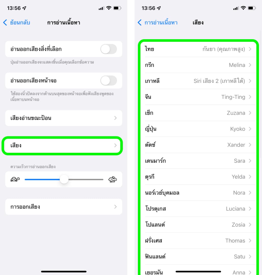 นอกจากนี้ยังมีฟีเจอร์เปลี่ยนเสียง Siri ให้เราเลือกใช้ได้ตามชอบ เพียงแตะเข้าไปที่ “เสียง” แล้วเลือกเสียงของ Siri ตามภาษาต่าง ๆ ที่ต้องการได้เลยค่ะ