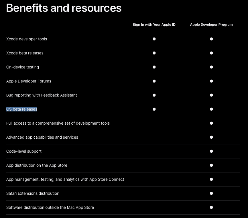 *ความแตกต่าง คือ ผู้ใช้ที่ลงทะเบียนทดสอบ Developer Beta ด้วย Apple ID จะสามารถเข้าถึงฟีเจอร์สำหรับนักพัฒนาบางอย่างได้ เช่น ติดตั้ง OS Beta, ส่ง Feedback, ดู Forum ต่าง ๆ ได้ ส่วน Apple Developer Beta Program ที่เสียเงิน 3,500 บาท/ปี จะเข้าถึงเครื่องมือสำหรับนักพัฒนาได้ทั้งหมด