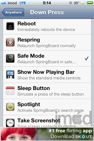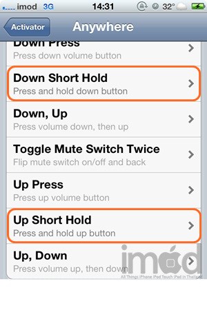 ติดตั้ง SBSettings (ชัวร์เครื่องคุณต้องเจลเบรคเท่านั้น) แล้วไปตั้งค่าใน Activator ให้เลือกเข้าไปที่ Anywhere แล้วเลื่อนไปที่ Volume Buttones เลือก Down Short Hold และ Up Short Hold