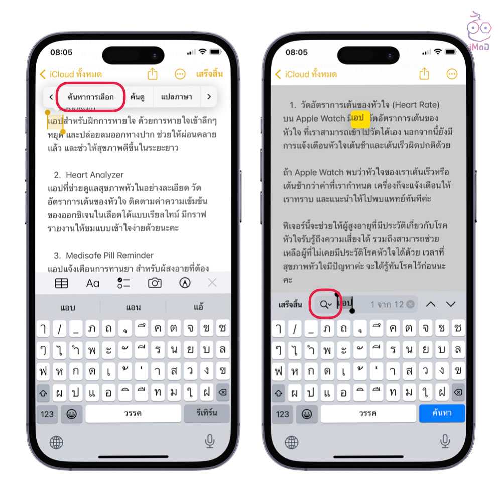 อีกหนึ่งวิธีสำหรับการค้นหาและแทนที่ก็ง่ายเช่นกัน เพียงแค่เราเลือกคำภายในโน้ต จากนั้นก็แตะเมนู ค้นหาการเลือก (Find Selection) > แตะไอคอนค้นหาเหมือนเดิม