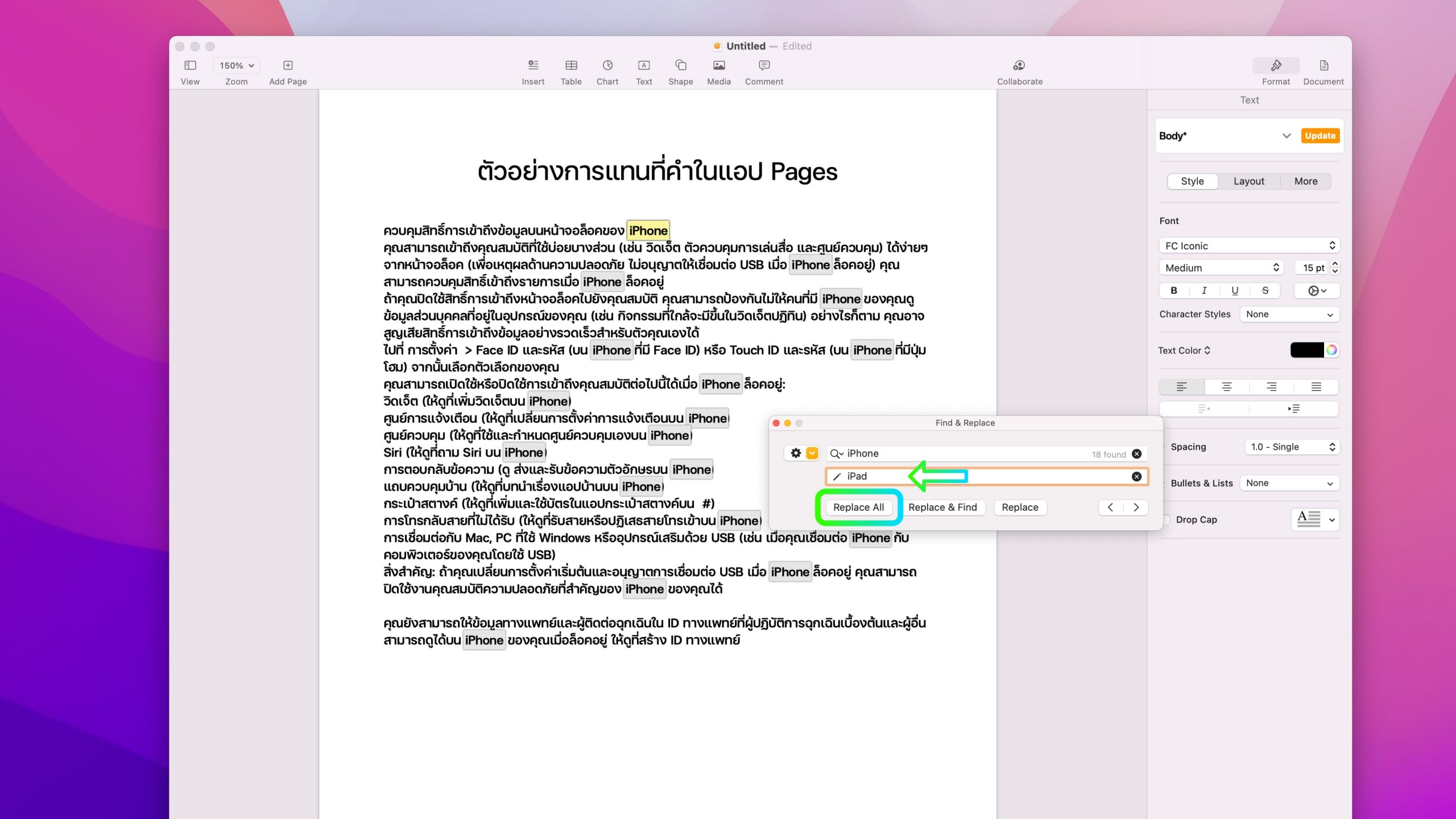 ผลลัพธ์ที่ได้ ในการแทนที่คำว่า “iPhone” ด้วยคำว่า “iPad”