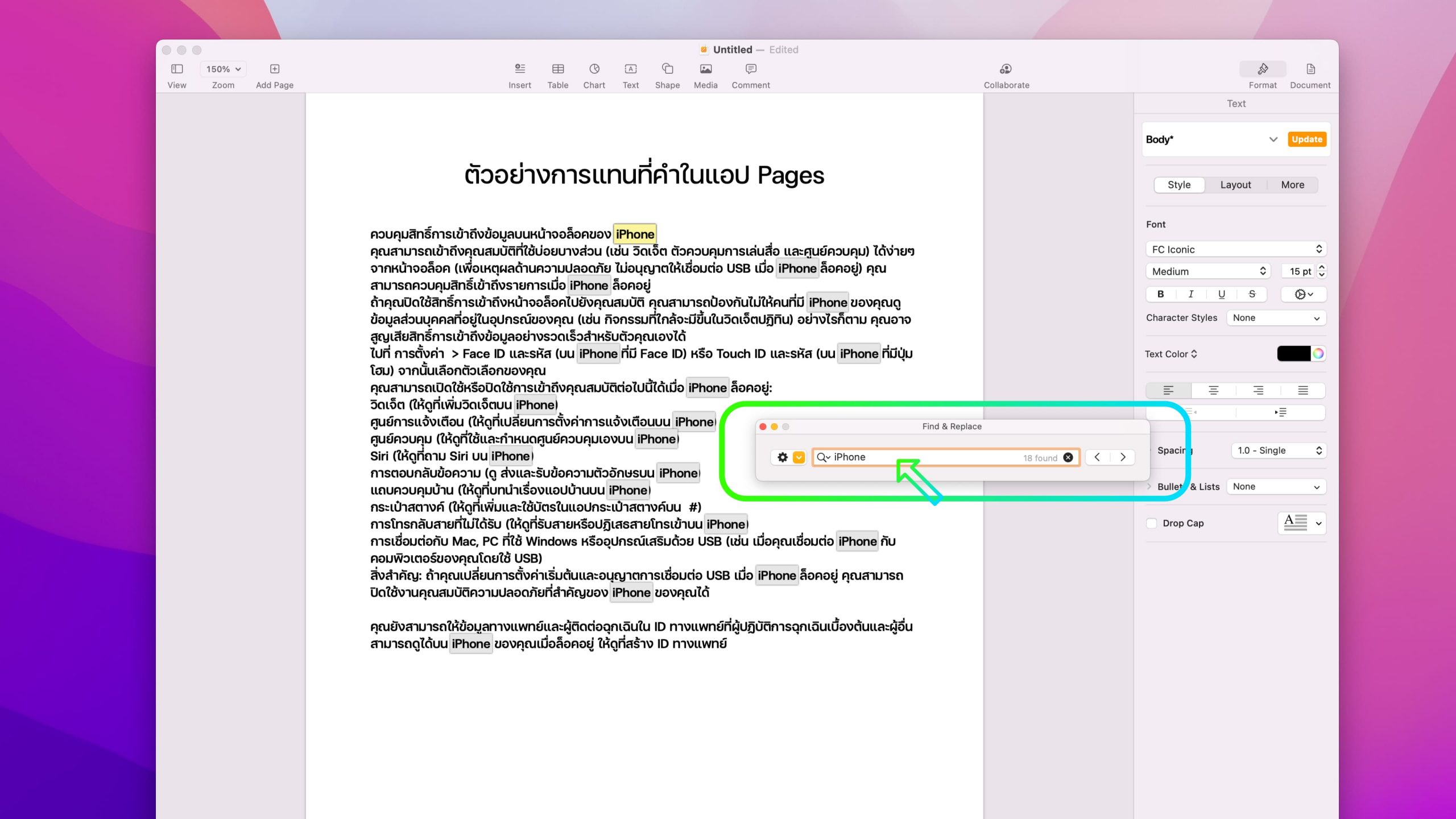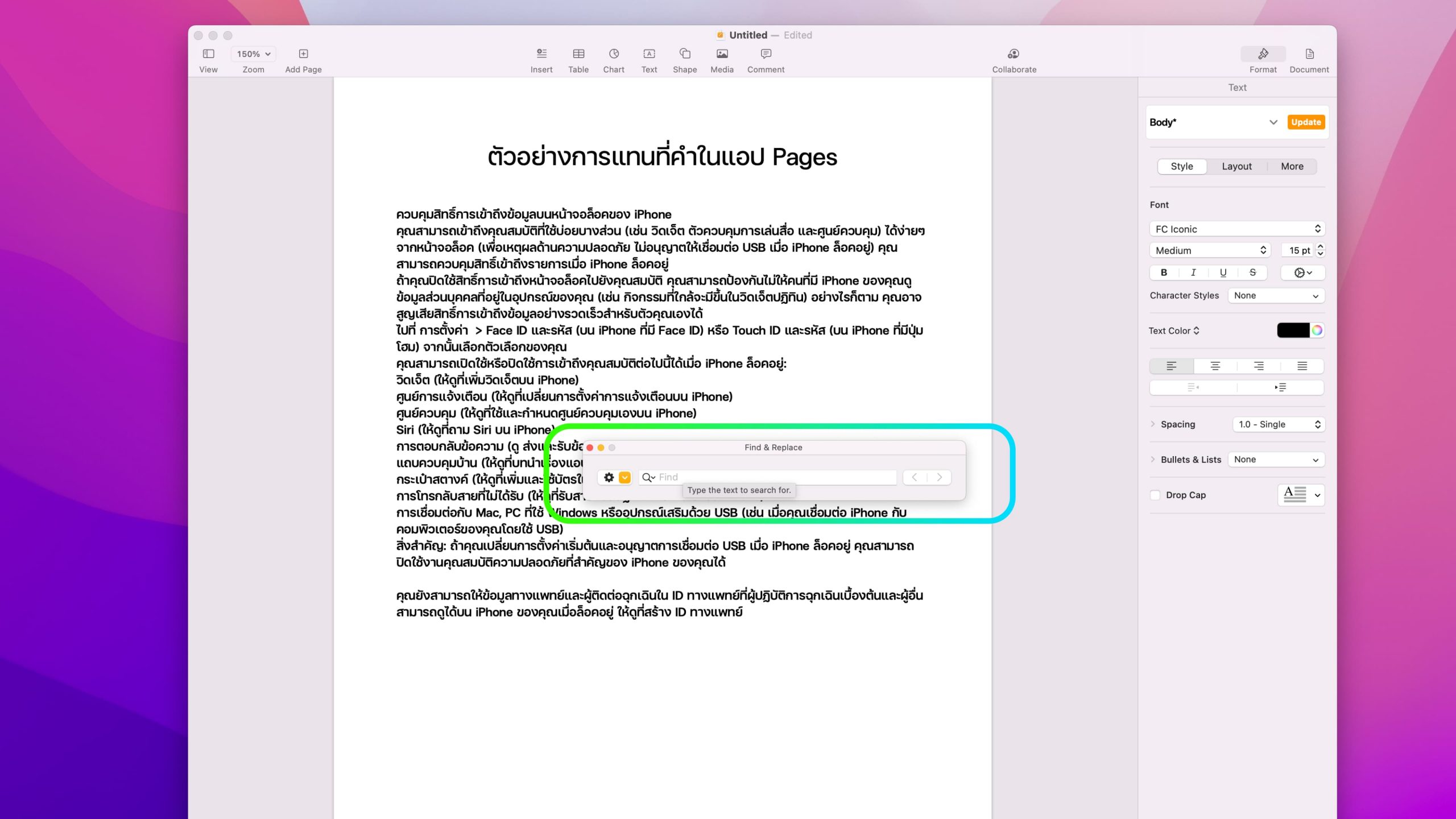 เปิดหน้าเอกสารขึ้นมาในแอป Pages จากนั้นกด Command+F จะมีหน้าต่าง Find (ค้นหา) ปรากฏขึ้นมา