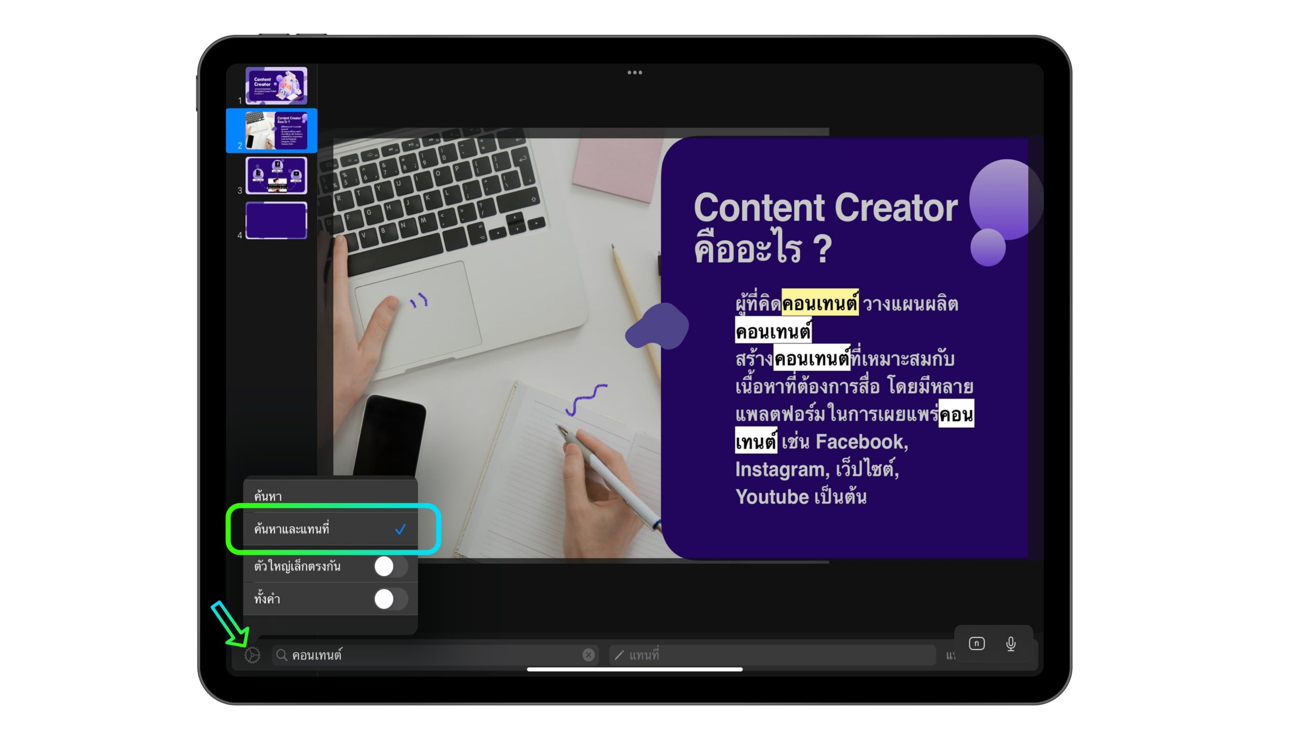การค้นหาและแทนที่คำมักจะถูกใช้ค้นหาแล้วแก้ข้อความที่เราพิมพ์ผิดหลาย ๆ ที่ในงานนำเสนอหรือในหน้าเอกสารที่มีข้อมูลเยอะ ๆ หากใช้งานฟีเจอร์นี้เราจะได้ไม่ต้องมานั่งหาและแก้ไขทีละคำนั่นเอง