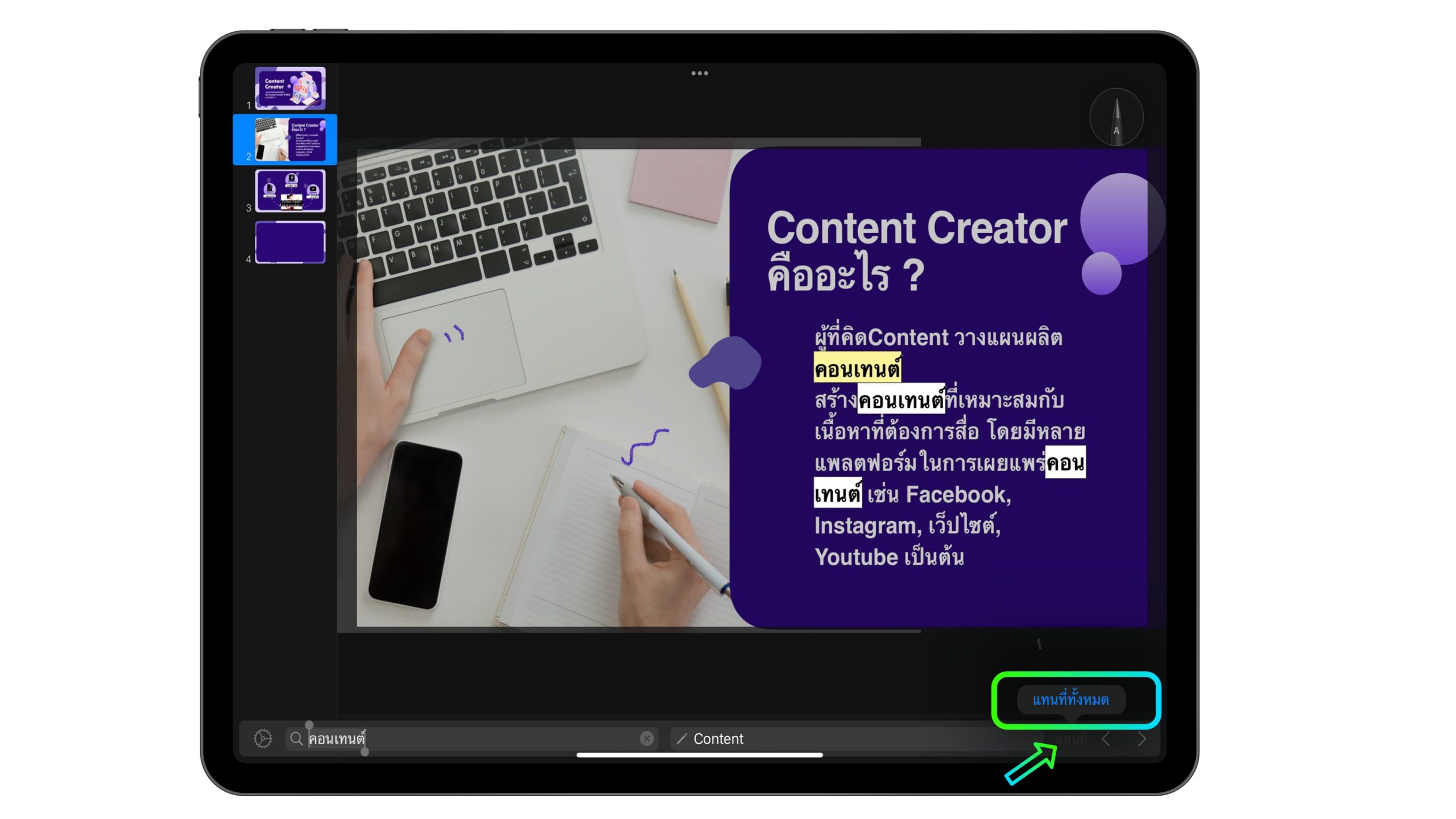 ใส่คำที่ต้องการแทนที่ลงไปในช่อง จากนั้นกดที่ปุ่มแทนที่ค้างไว้ จะมีคำสั่ง “แทนที่ทั้งหมด” ให้เลือกใช้