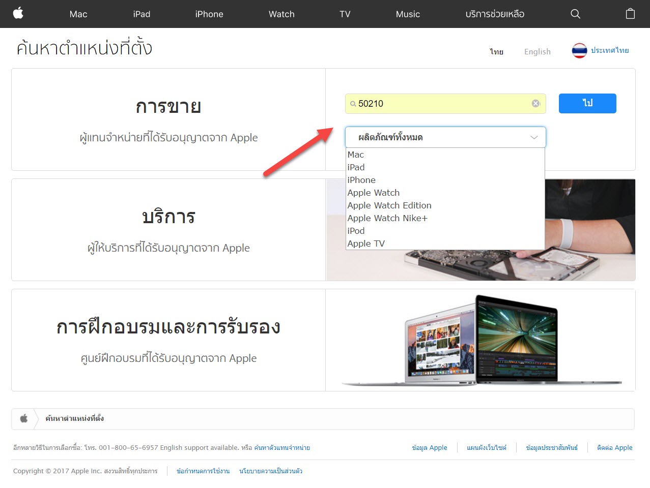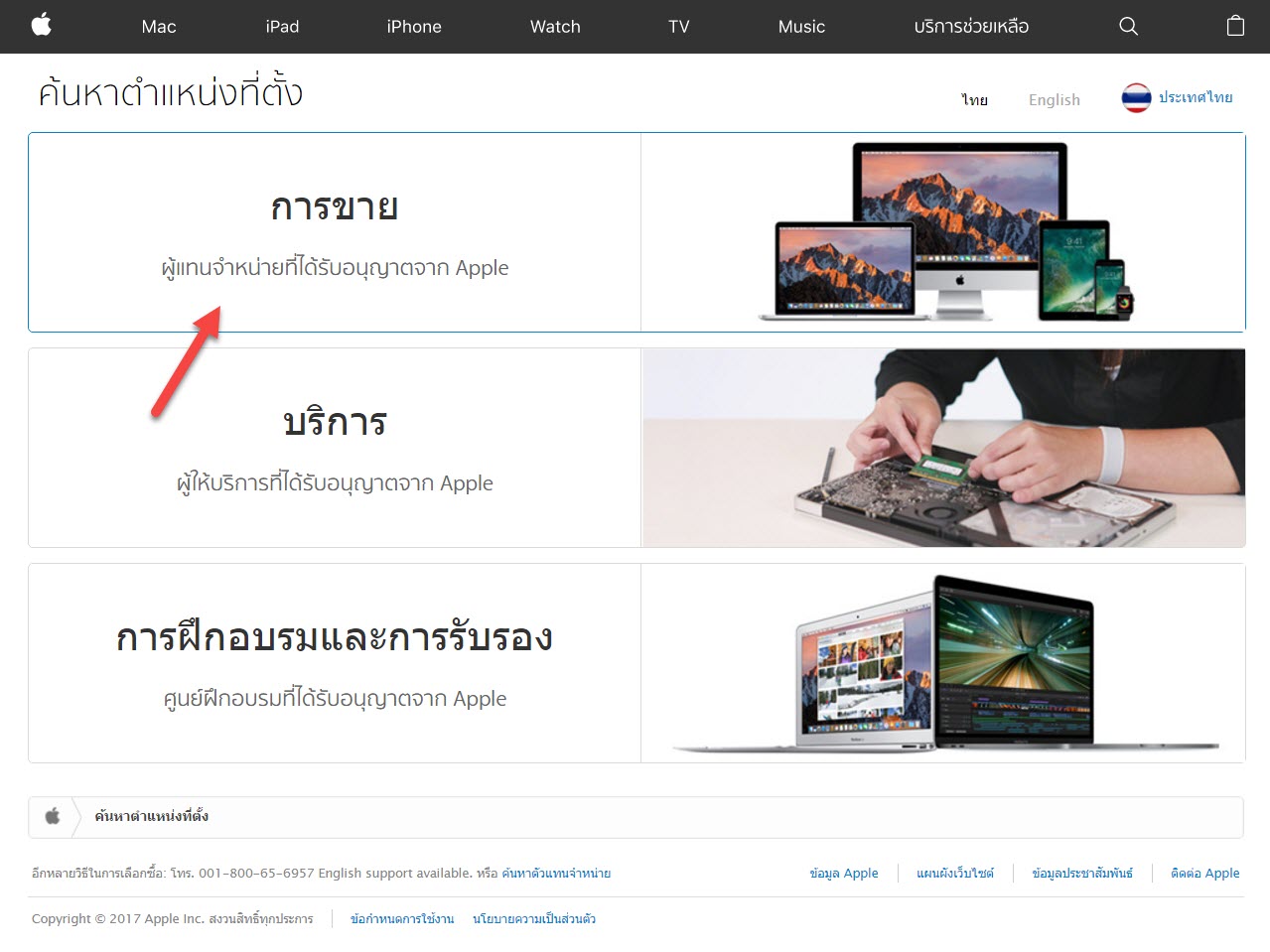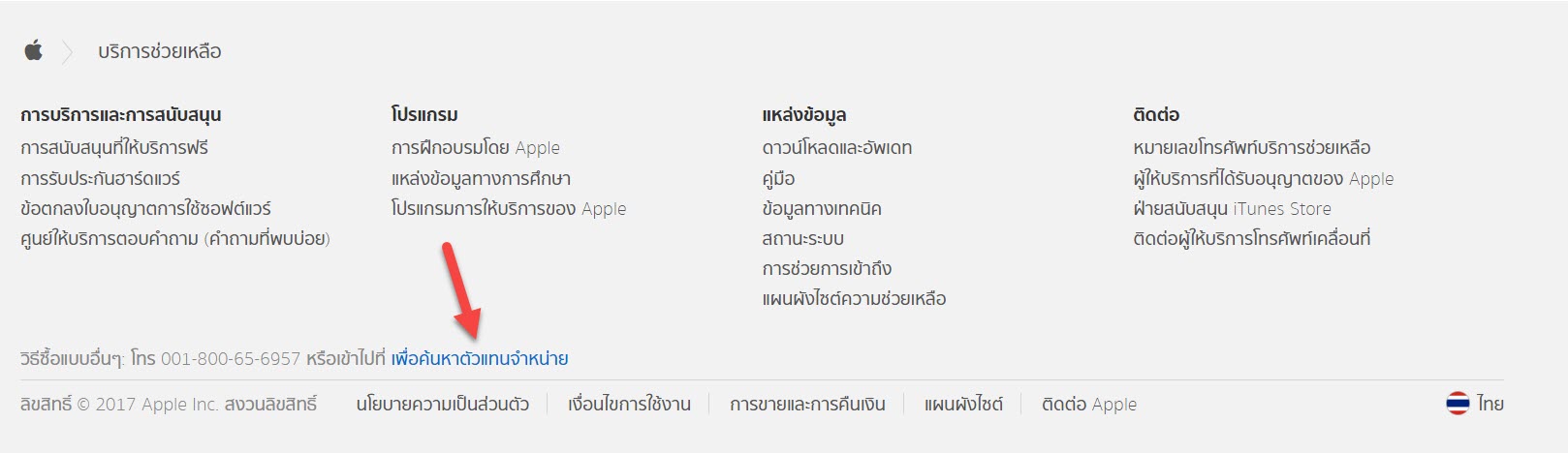 ไปที่เว็บไซต์ Apple.com > เลื่อนลงมาที่ด้านล่างของหน้าจอ เลือก ค้นหาตัวแทนจำหน่าย