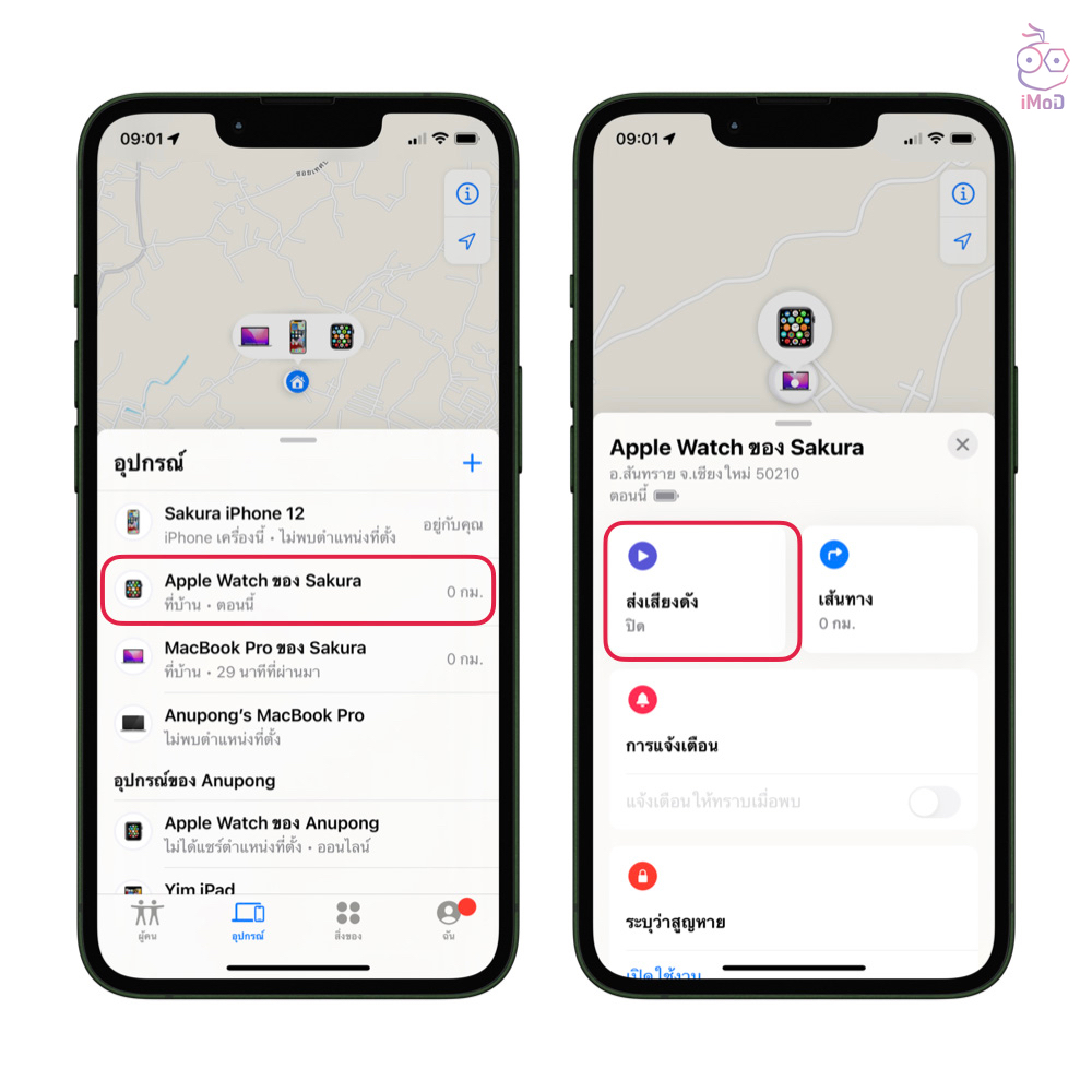 ไปที่แอปค้นหาของฉัน (Find My) > แถบอุปกรณ์ เลือกแตะเลือก Apple Watch > แตะ เล่นเสียง (Play Sound)