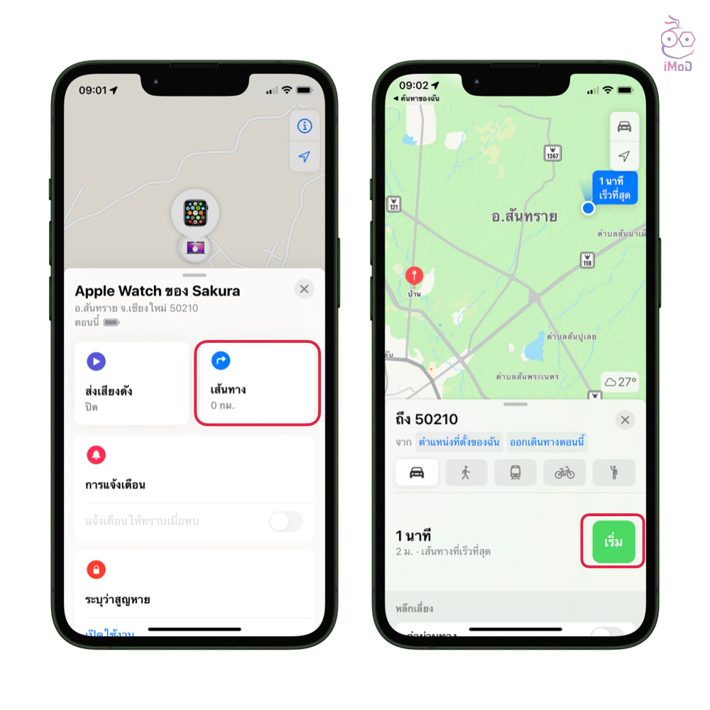 เรายังสามารถแตะ เส้นทาง (Directions) เพื่อค้นหา Apple Watch ตามที่ระบุในแผนที่ได้ด้วย
