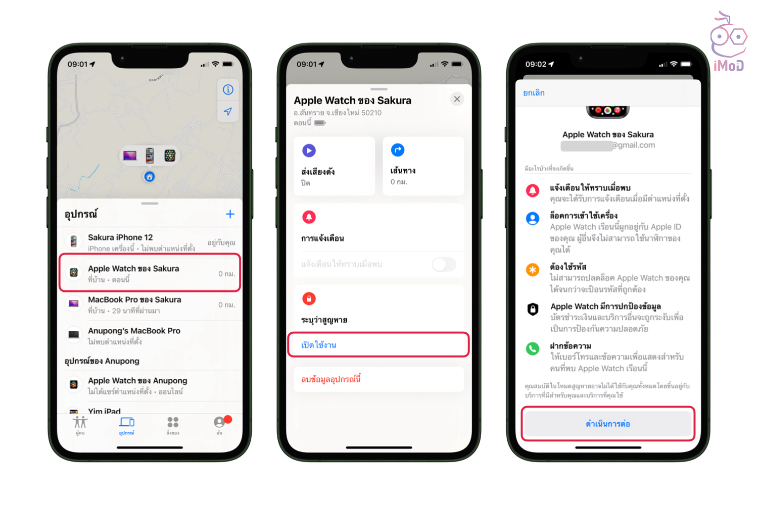 ไปที่แอปค้นหาของฉัน (Find My) > แถบอุปกรณ์ เลือกแตะเลือก Apple Watch > ในส่วน ระบุว่าสูญหาย ให้แตะ เปิดใช้งาน (Activate) > เราจะเห็นคำอธิบายว่าเมื่อเปิดโหมดสูญหายแล้ว Apple Watch จะทำงานอย่างไรบ้าง ให้เราแตะ ดำเนินการต่อ (Continue)