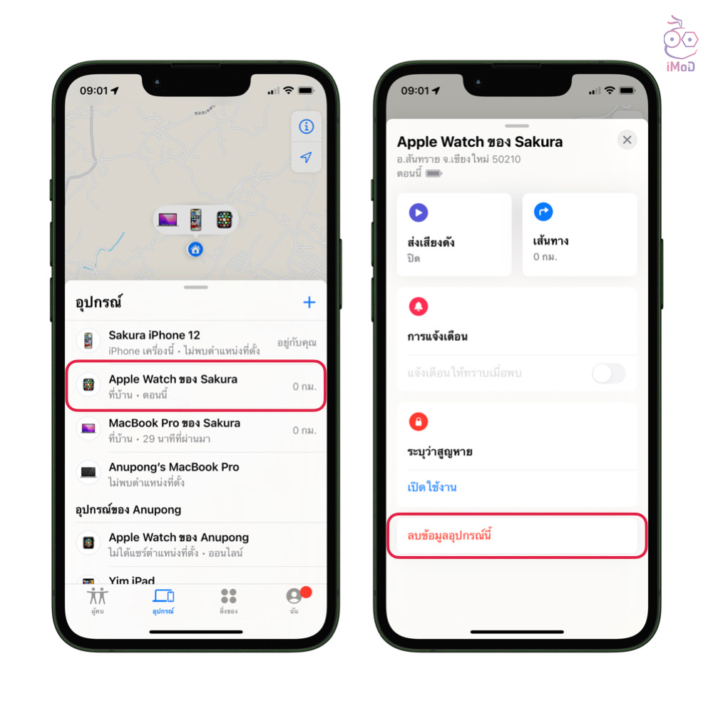 ไปที่แอปค้นหาของฉัน (Find My) > แถบอุปกรณ์ เลือกแตะเลือก Apple Watch > แตะ ลบข้อมูลอุปกรณ์นี้ (Erase This Device)