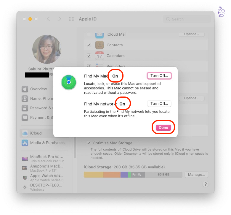 เปิดตัวเลือก Find My Mac และ Find My Network ให้เป็น On ทั้งคู่ แล้วคลิก Done