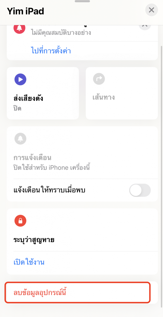 - การลบข้อมูลระยะไกลจะลบข้อมูลทั้งหมดที่อยู่ในเครื่องและจะไม่สามารถติดตามเครื่อง โดยใช้ Find My ได้อีก ดังนั้นก่อนลบข้อมูลควรพิจารณาให้ดีและมั่นใจจริง ๆ ว่าจะไม่ได้เครื่องคืนแล้ว