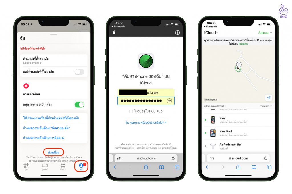 แตะที่แถบ ฉัน > ช่วยเพื่อน (Help a Friend) > แอปจะเปิดหน้าเว็บไซต์ iCloud ให้เราล็อกอิน Apple ID ของเครื่องที่หาย > แล้วค้นหาตำแหน่งได้เลย