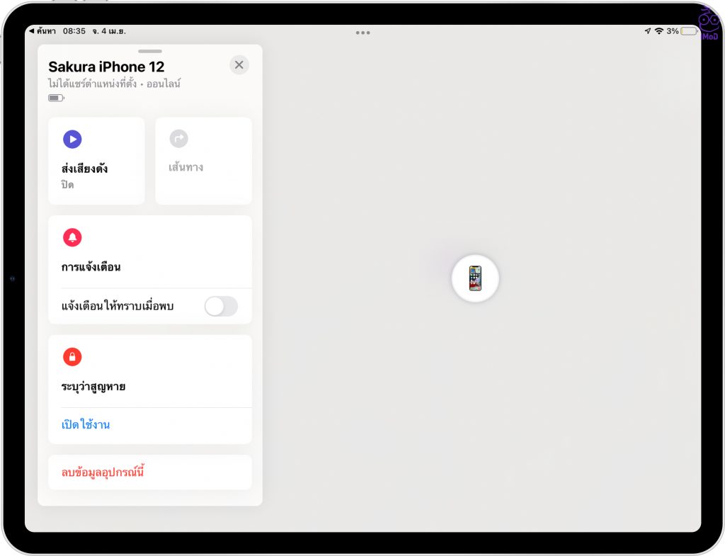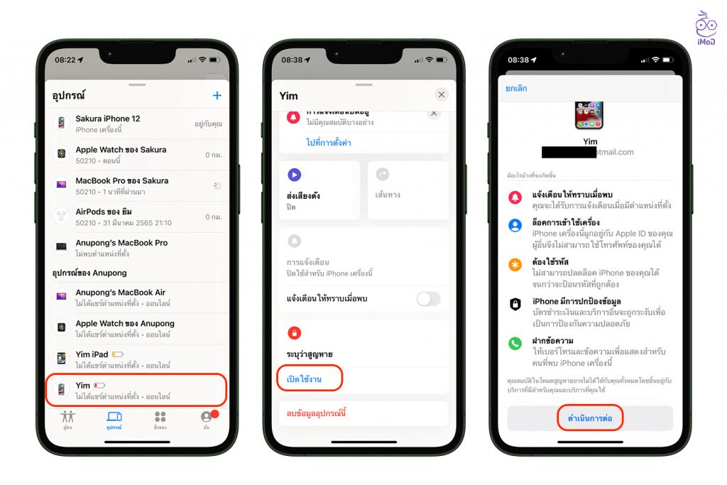 ไปที่แอป Find My แล้วเลือกอุปกรณ์ที่ต้องการค้นหา > ส่วนของระบุว่าสูญหาย (Lost Mode) ให้เลือก เปิดใช้งาน > ดำเนินการต่อ