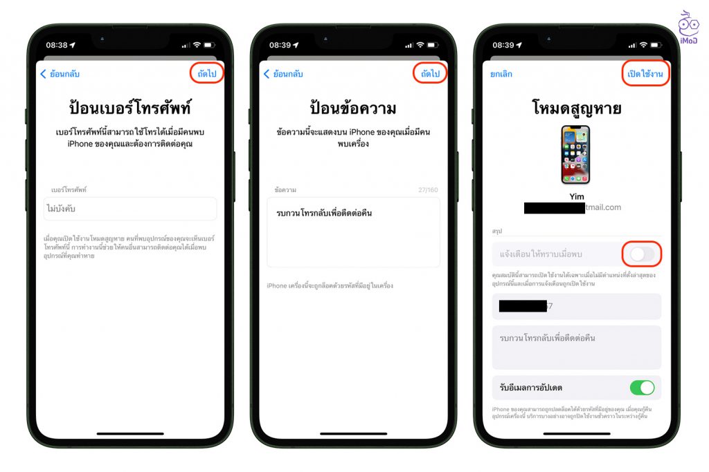 กรอกเบอร์โทรศัพท์และข้อความที่ต้องการให้ผู้พบเห็นติดต่อกลับ > เปิดการแจ้งเตือนให้ทราบเมื่อพบ (หากเครื่องไม่ได้อยู่ในตำแหน่งเดียวกับที่เราอยู่) > เปิดใช้งาน