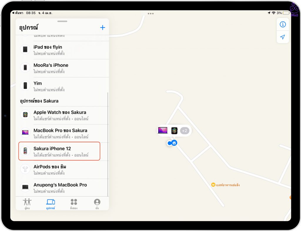 สำหรับอุปกรณ์ที่ลงชื่อเข้าใช้ Apple ID เดียวกันหรืออุปกรณ์ของคนที่เป็นสมาชิกครอบครัว (Family Sharing) จะสามารถค้นหาผ่านแอป Find My ได้เลย เช่น ใช้ iPad ค้นหา iPhone