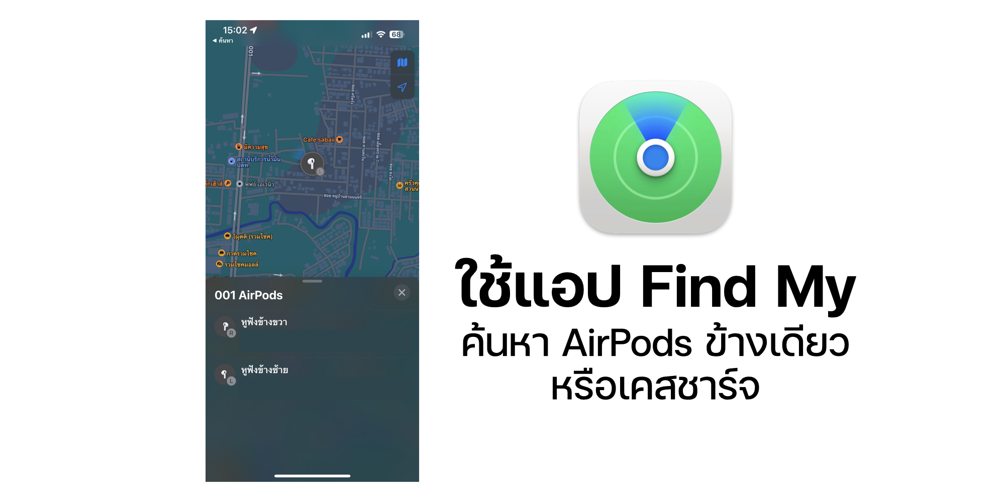 วิธีการคือ ไปที่แอป Find My > เลือก “อุปกรณ์” > แตะชื่อ AirPods ที่ต้องการค้นหา หากทำ AirPods หายข้างเดียวจะขึ้นสถานะ “อยู่ข้างนอกเคส”
