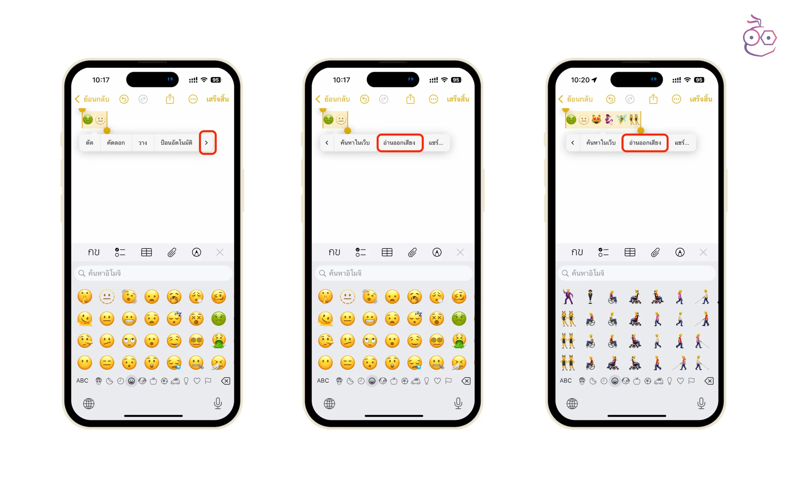 ไปที่ แอปโน้ต (Note) หรือแอปอื่น ๆ ที่สามารถพิมพ์ได้ เช่น ข้อความ, ช่อง Url ใน Safari > เลือกอิโมจิที่เราต้องการทราบความหมาย > แตะไอคอนถัดไป จนเห็นตัวเลือก “อ่านออกเสียง” จากนั้นก็แตเลือก อ่านออกเสียง ได้เลย เราก็จะได้ยินความหมายของอิโมจิที่เราเลือก