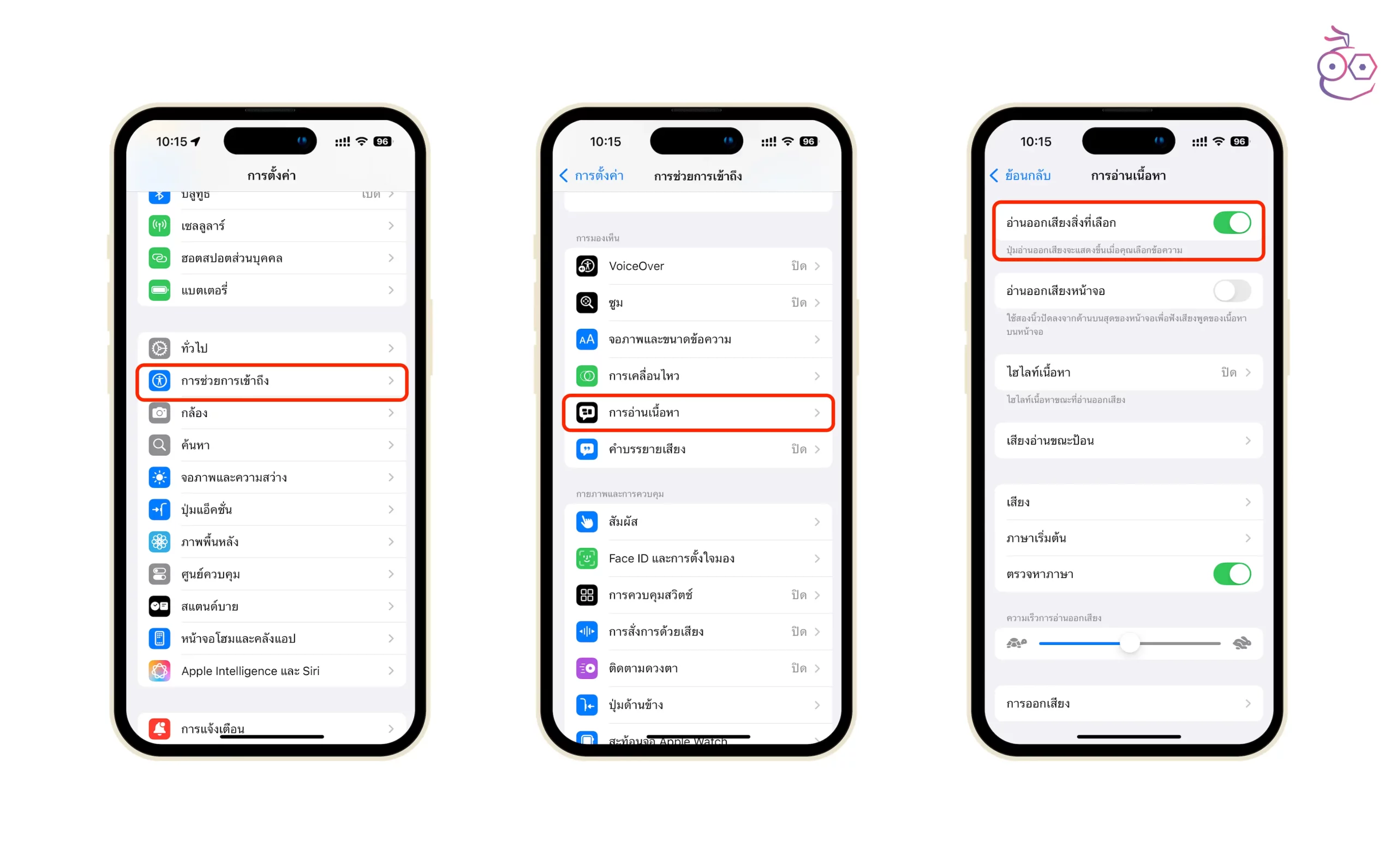 ไปที่ การตั้งค่า (Setting) > การช่วยการเข้าถึง (Accessibility) > การอ่านเนื้อหา (Spoken Content) > เปิด อ่านออกเสียงสิ่งที่เลือก (Speak Selection)