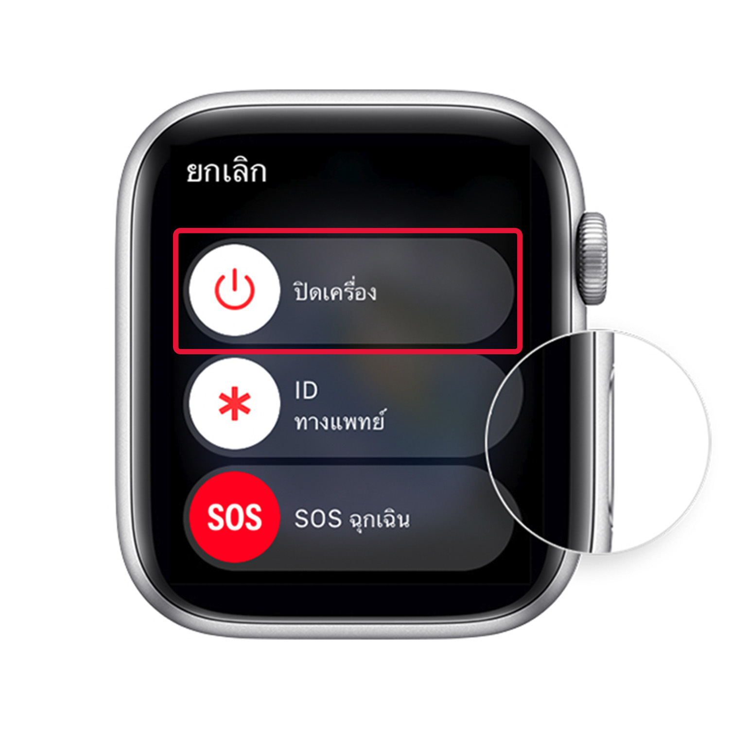 กดปุ่มด้านข้าง Apple Watch ค้างไว้ แล้วเลื่อนปิดเครื่อง (Power off) เมื่อเครื่องปิดแล้ว ให้เราเปปิดเครื่องอีกครั้ง โดยการกดปุ่มด้านข้างค้างไว้จนโลโก้ Apple ขึ้น