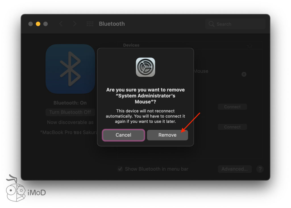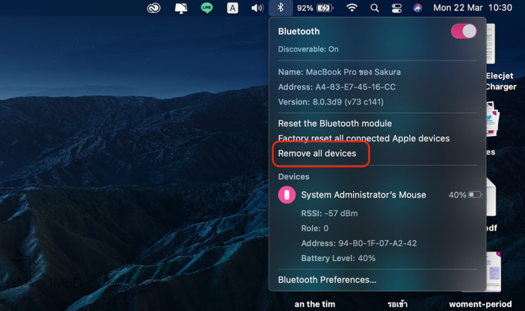กดปุ่ม Option + Shift ค้างไว้พร้อมกัน แล้วคลิกไอคอน Bluetooth ที่ Menu Bar > คลิกเลือก Remove all devices แล้วคลิก OK
