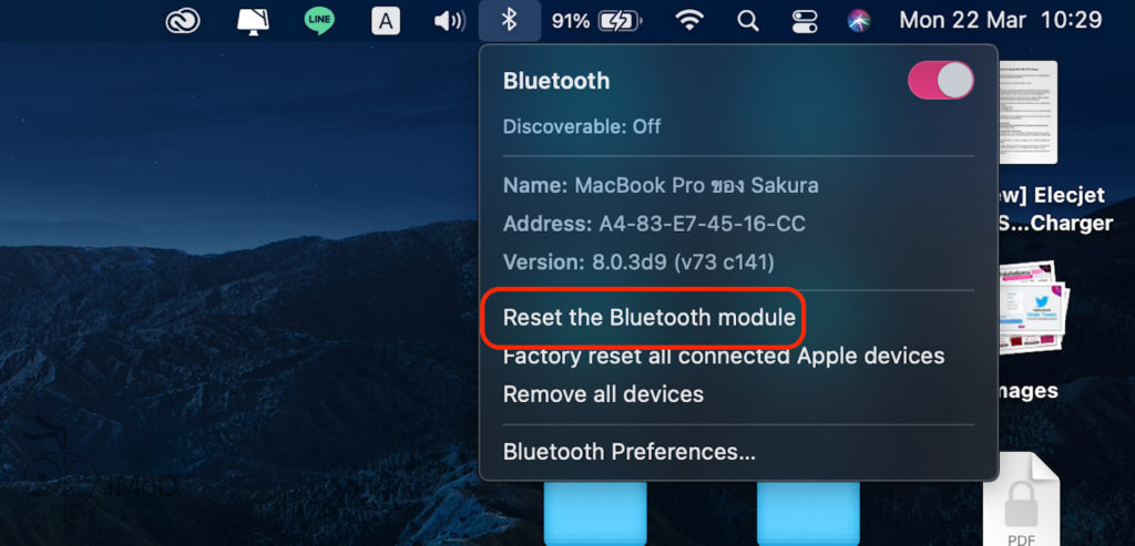 กดปุ่ม Option + Shift ค้างไว้พร้อมกันที่คีย์บอร์ด แล้วคลิกไอคอน Bluetooth ที่ Menu Bar > คลิกเลือก Reset the Bluetooth module