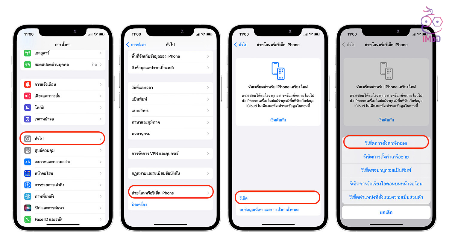 ทำได้โดยการไปที่ การตั้งค่า (Settings) > ทั่วไป (General) > ถ่ายโอนหรือรีเซ็ต iPhone (Transfer or Reset iPhone) > รีเซ็ต (Reset) > รีเซ็ตการตั้งค่าทั้งหมด (Reset All Settings)