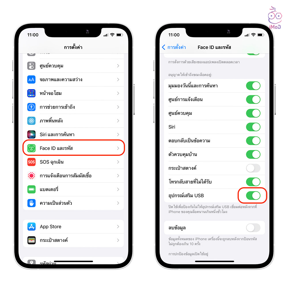 ให้เราเปิดการอนุญาตให้อุปกรณ์เสริม USB เข้าถึงอุปกรณ์ขณะล็อคอยู่นานเกิน 1 ชั่วโมง ถ้าเราไม่ได้เปิดใช้งานไว้ เมื่อเราเสียบสายเพื่อเชื่อมต่อ iPhone, iPad กับอุปกรณ์อื่น เราจะเห็นข้อความว่า ไม่รองรับอุปกรณ์เสริม ดังนั้นถ้าหากเราต้องใช้งานการเชื่อมต่อ ก็แนะนำให้เปิดใช้งานไว้