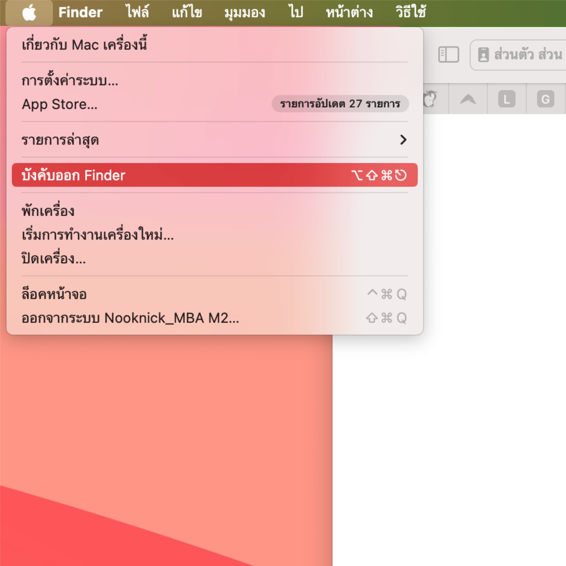 - คลิกที่ไอคอน Apple ที่มุมซ้ายบนของหน้าจอ แล้วเลือก “บังคับออก”
