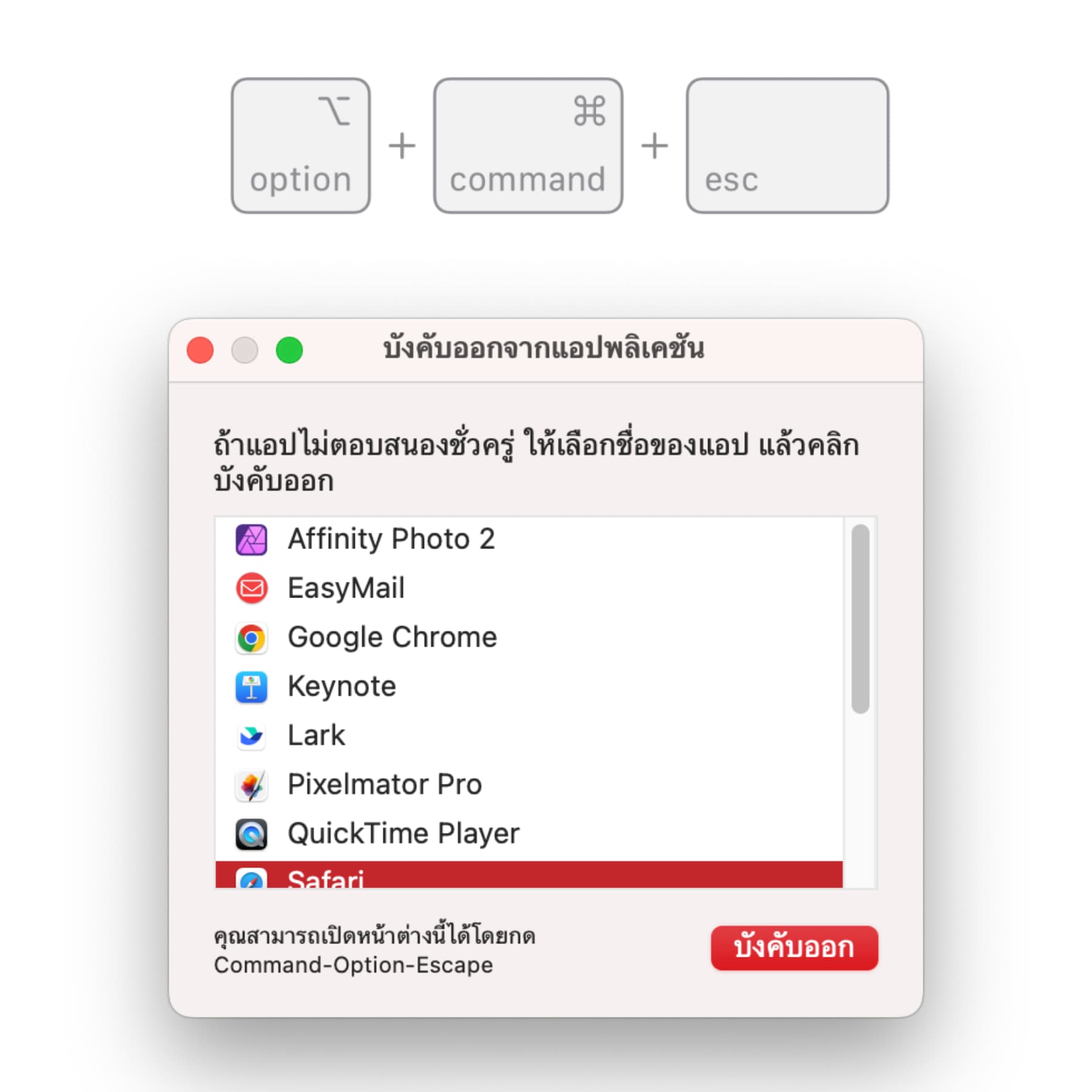 2. กดปุ่ม Option + Command + Esc พร้อมกัน เพื่อเปิดเมนู “บังคับปิดแอปพลิเคชัน” เลือกแอปพลิเคชันที่คุณต้องการปิด แล้วคลิก “บังคับปิด”