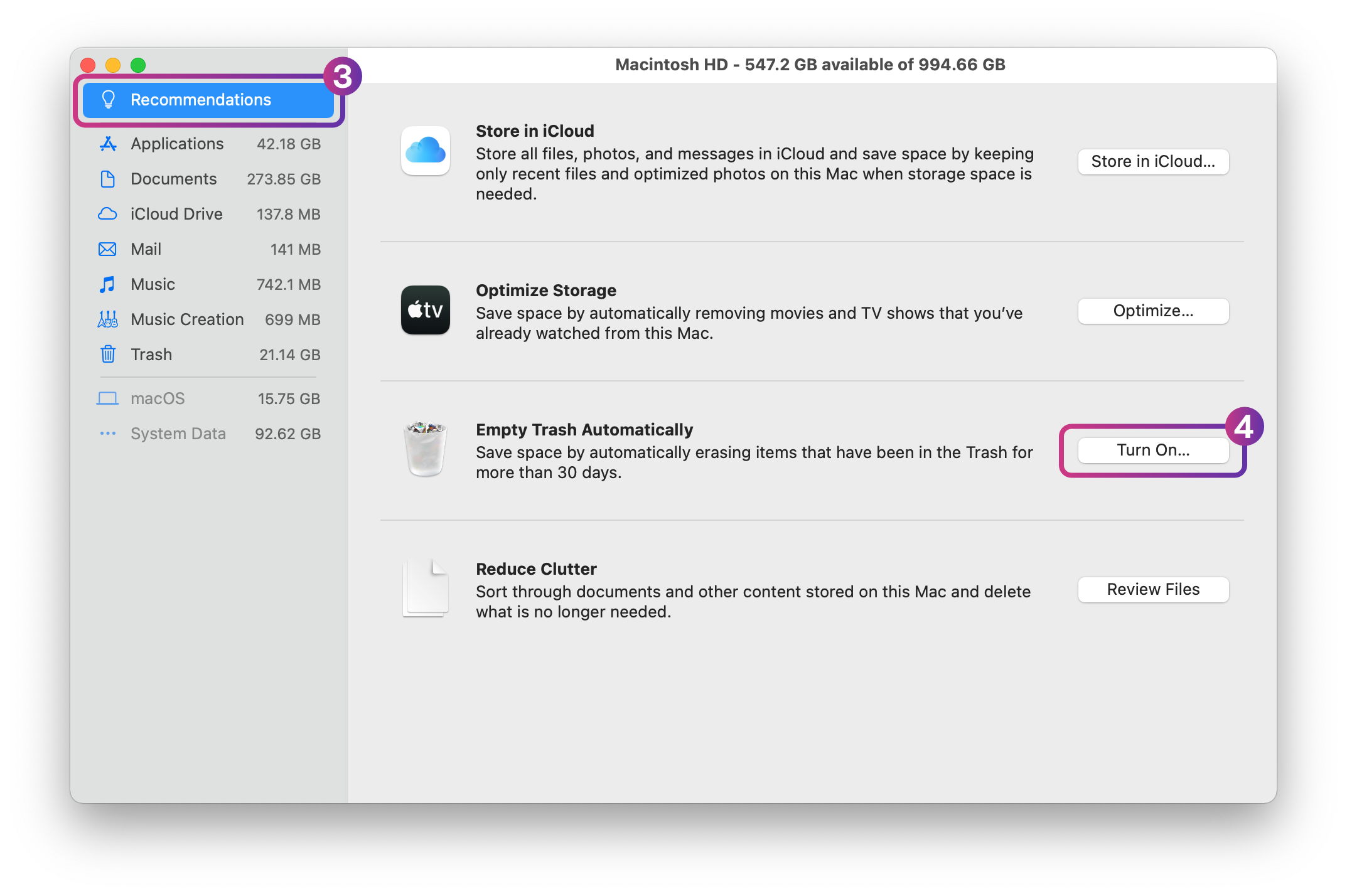 ไฟล์ที่ถูกย้ายไปที่ถังขยะจะค้างอยู่ในนั้นเป็นเวลา 30 วัน ก่อนจะถูกลบโดยอัตโนมัติ ซึ่งเราสามารถเข้าไปตั้งค่าได้หากต้องการให้ไฟล์ลบโดยอัตโนมัติ โดยคลิกที่ปุ่มโลโก้  > เลือก About This Mac > คลิก Storage > คลิก Manage > ไปที่แถบด้านซ้าย คลิกเมนู Recommendations > คลิก Turn On เพื่อเปิดการล้างถังขยะโดยอัตโนมัติ