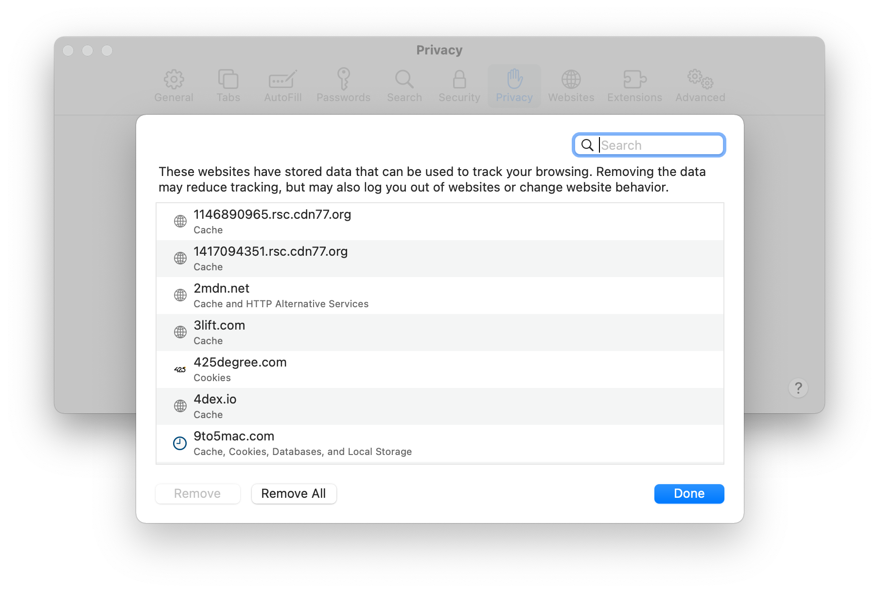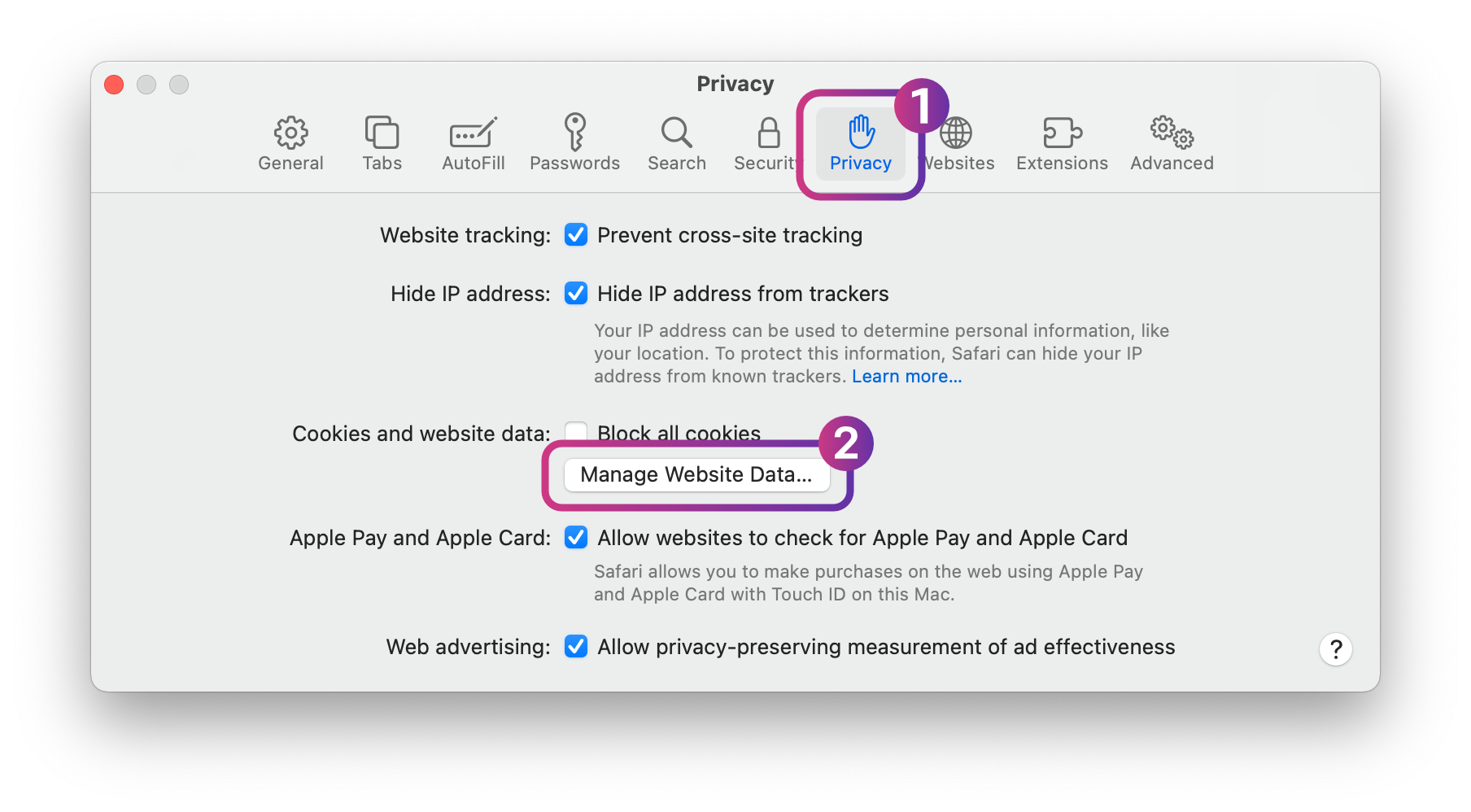 2. คลิก Privacy > Manage Website Data > คลิก Remove All