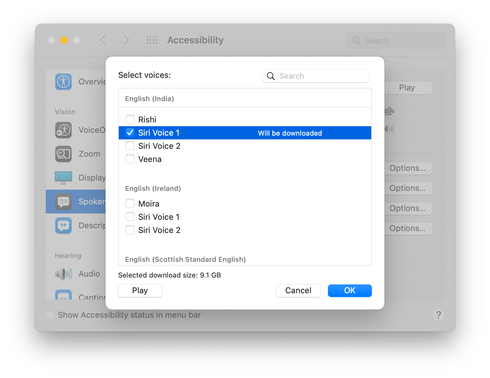 ถ้าเราลบไฟล์เสียงที่มีอยู่บนเครื่อง Mac ก็จะช่วยประหยัดพื้นที่ได้ ให้ไปที่ การตั้งค่า > การช่วยการเข้าถึง > เนื้อหาที่พูด (Spoken Content) > คลิกแถบ System Voice > เลือกเมนู Customize ปรับแต่ง และยกเลิกการเลือกเสียงเพิ่มเติม