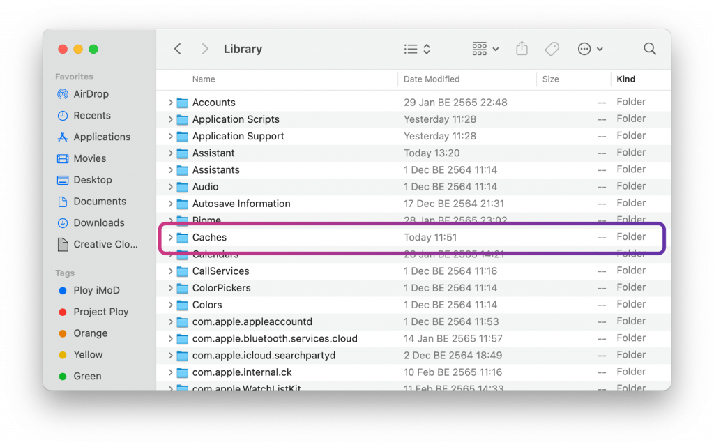 3. เปิดโฟลเดอร์แคช > ลบโฟลเดอร์และไฟล์ได้เลย หรือ กด Command + A เพื่อเลือกย้ายทุกไฟล์ไปที่ถังขยะ