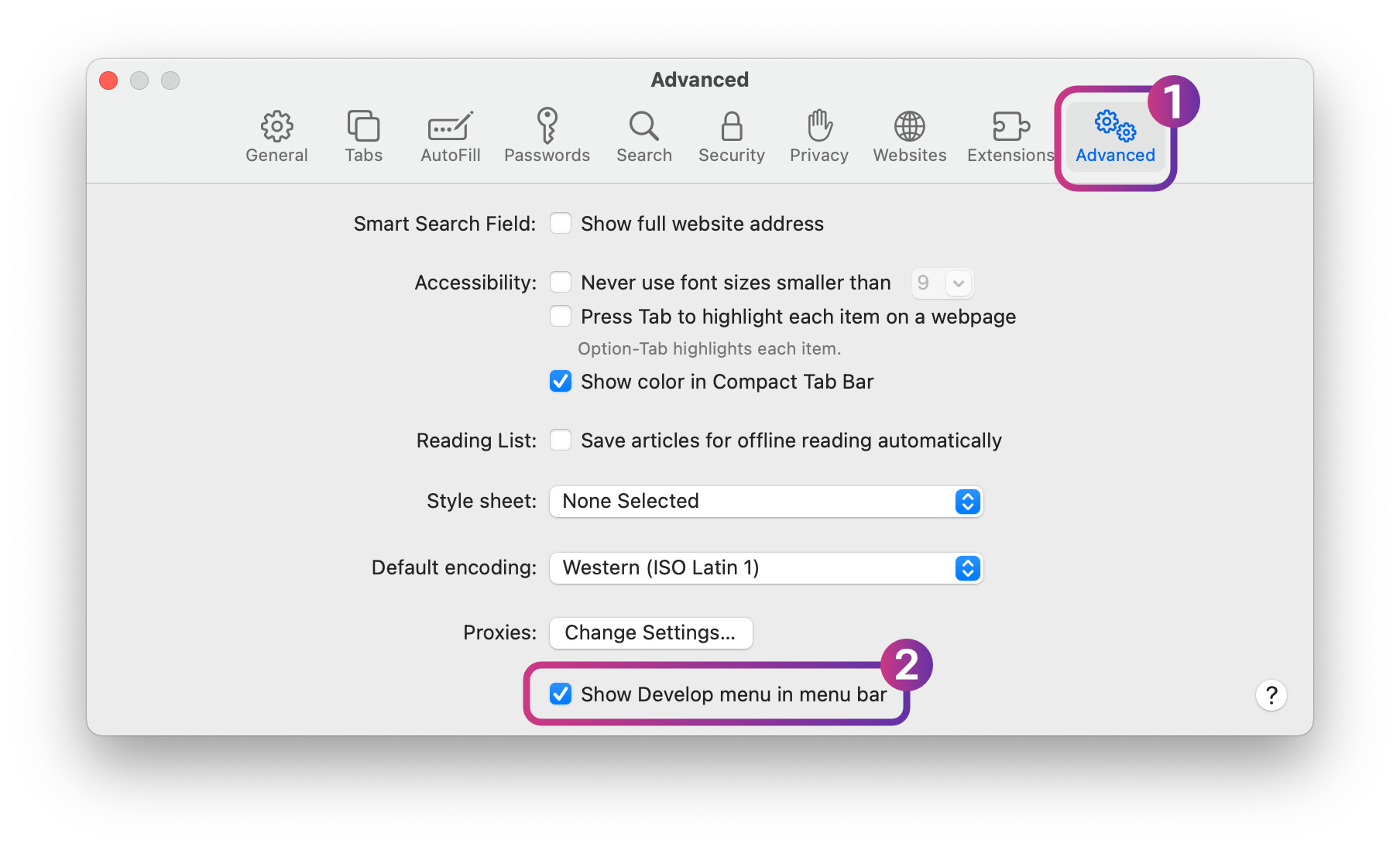 เปิด Safari แล้วกดปุ่ม Command + Comma (,) > คลิก “Advanced” > คลิกเปิดใช้งานแสดงเมนูพัฒนาในแถบเมนู (Show Develop menu in menu bar)