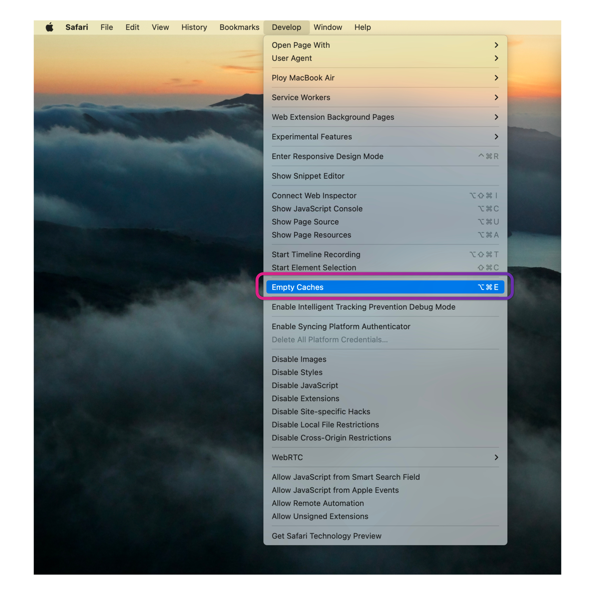 หลังจากนี้ไปเราสามารถกด Command + Option + E หรือคลิก Develop > Empty Caches