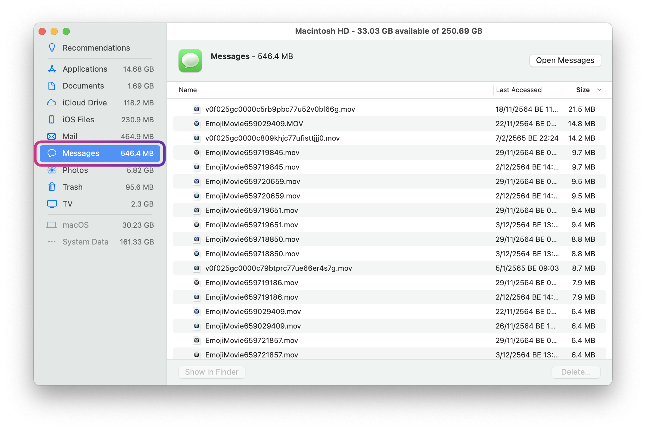 เราสามารถลบไฟล์แนบจากแอป Messages ได้ โดยคลิกที่โลโก้  > About This Mac > Storage > Manage > Messages สามารถลบไฟล์แนบแต่ละรายการหรือทั้งหมดได้