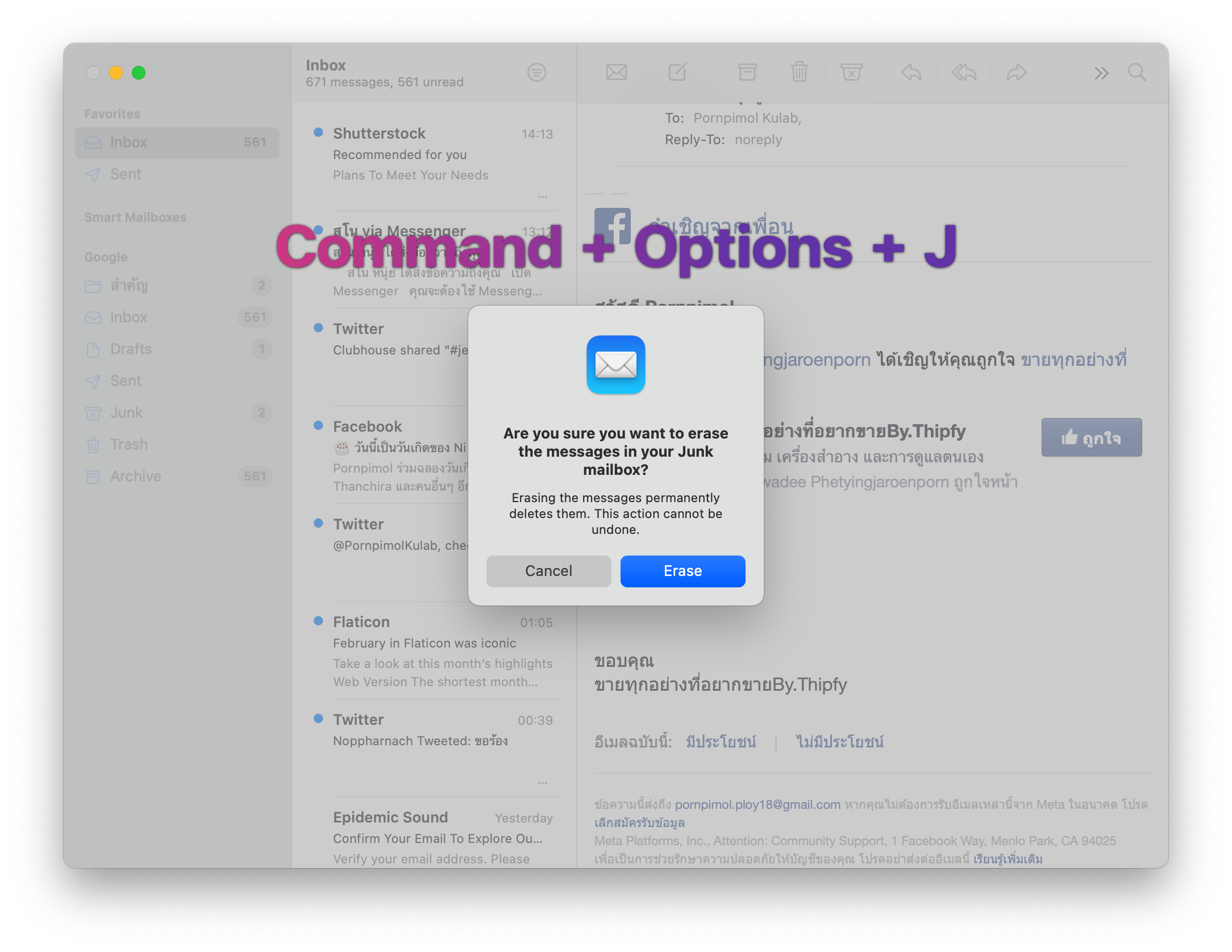 สามารถล้างไฟล์จากแอปเมลล์ได้ด้วยวิธีเดียวกับแอปข้อความ ซึ่งแอปเมลล์ของเราจะมีไฟล์มากมายที่เราอาจไม่ต้องการบน Mac เราสามารถลบอีเมลล์ขยะได้ด้วยการกด Command + Option + J หรือ คลิกกล่องจดหมาย > ลบเมลขยะ