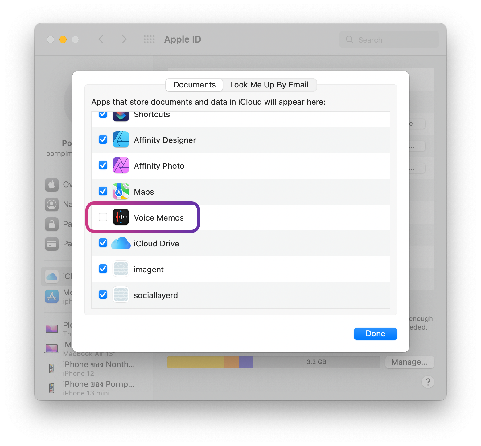หากไม่จำเป็นต้องใช้งาน Voice Memos สามารถลบได้โดยไปที่โลโก้  > System Preferences > Apple ID > iCloud > Options > ยกเลิกการเลือก Voice Memos > เสร็จสิ้น