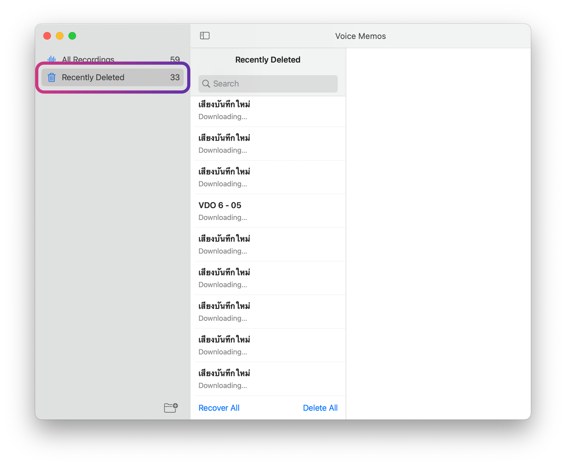 จากนั้นให้เปิดแอป Voice Memos แล้วลบเสียงในส่วนที่เพิ่งลบล่าสุดออก โดยเปิดแอป Voice Memos > คลิกแถบด้านซ้ายเลือก “ที่เพิ่งลบล่าสุด”