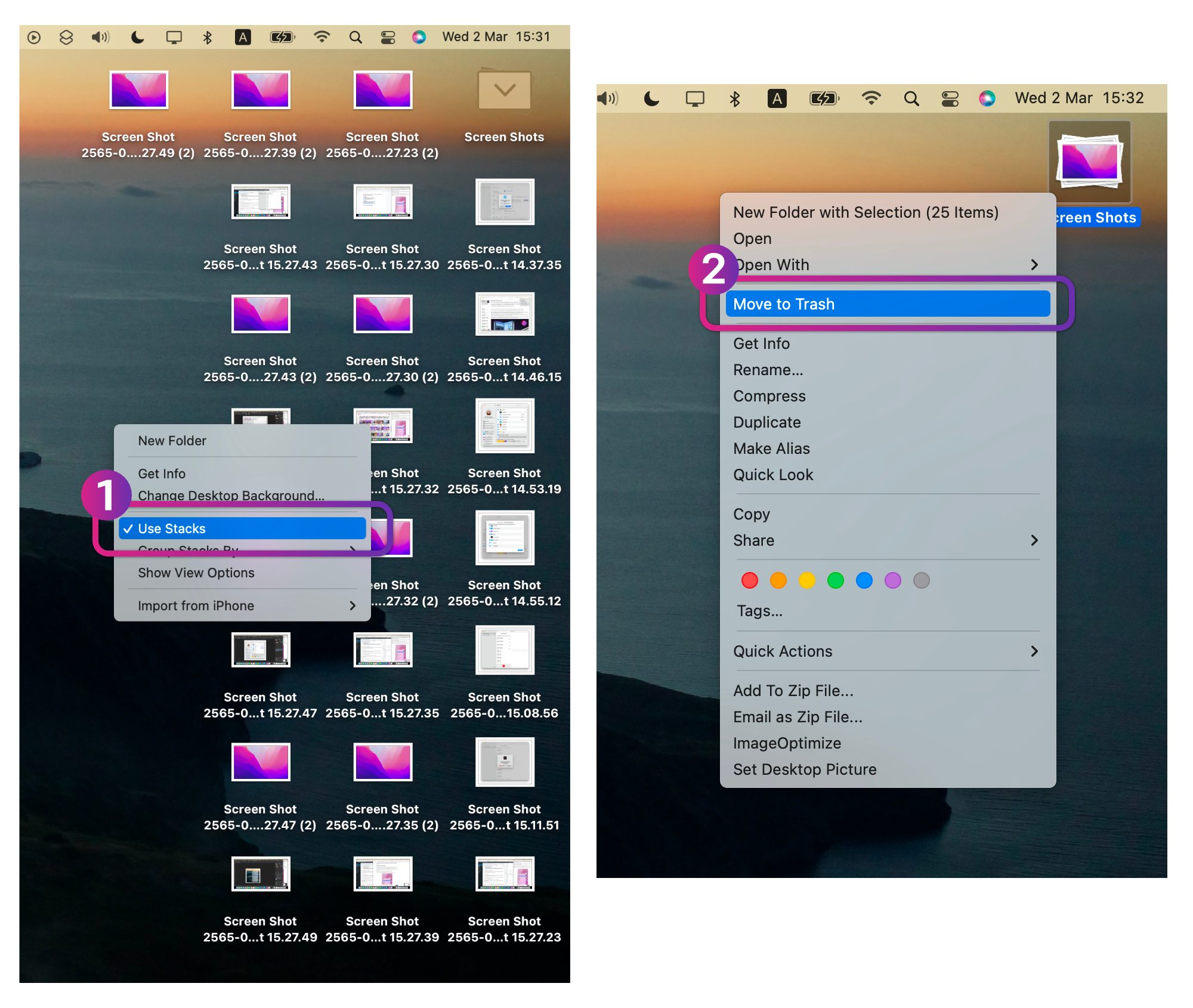 1. คลิกขวาบนเดสก์ท็อปของ Mac > เลือก Use Stacks จะรวมภาพหน้าจอทั้งหมดไว้ในชุดเดียว