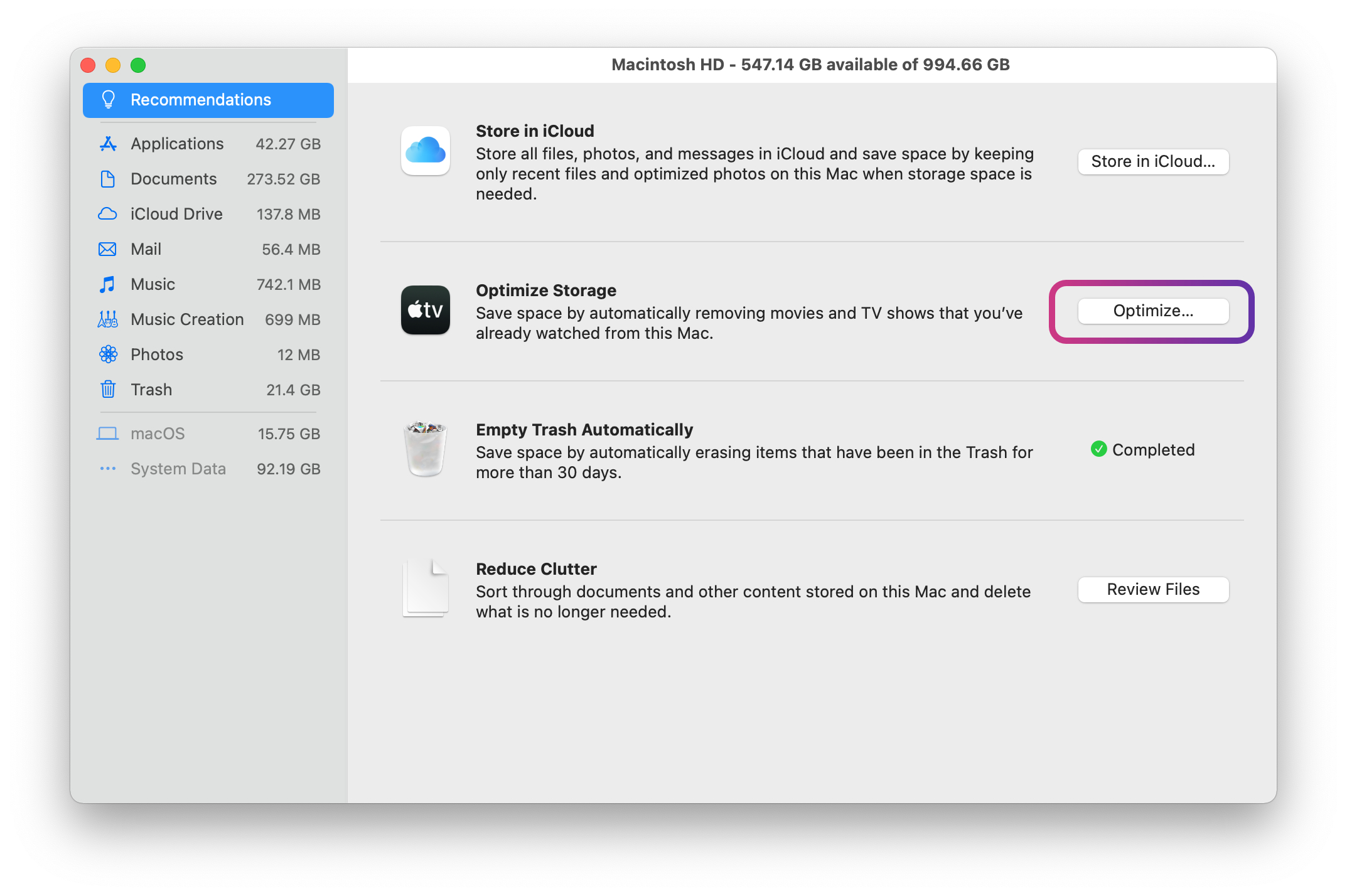 เราสามารถลบภาพยนตร์และรายการทีวีที่เราดูได้โดยอัตโนมัติ โดยคลิกที่โลโก้  > About This Mac > About This Mac > Storage > Manage > Recommendation > Optimize ถัดจากไอคอน tv