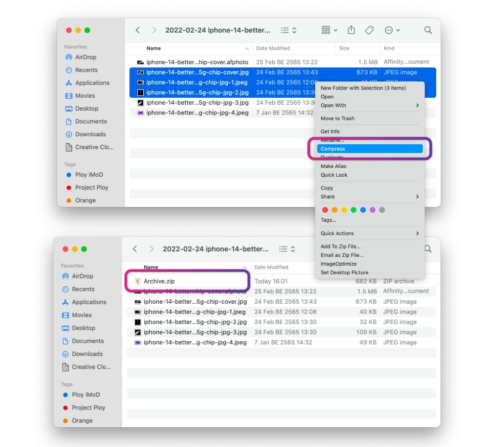 เป็นอีกหนึ่งวิธีในการเพิ่มพื้นที่ว่างโดยไม่ต้องลบไฟล์หรือโฟลเดอร์ นั่นคือ การบีบอัดไฟล์ นั่นเอง ทำได้โดยเลือกไฟล์ที่เราต้องการบีบอัด > คลิกขวา เลือก Compress เพียงเท่านี้เราก็จะได้ไฟล์ที่เราบีบอัดแล้ว