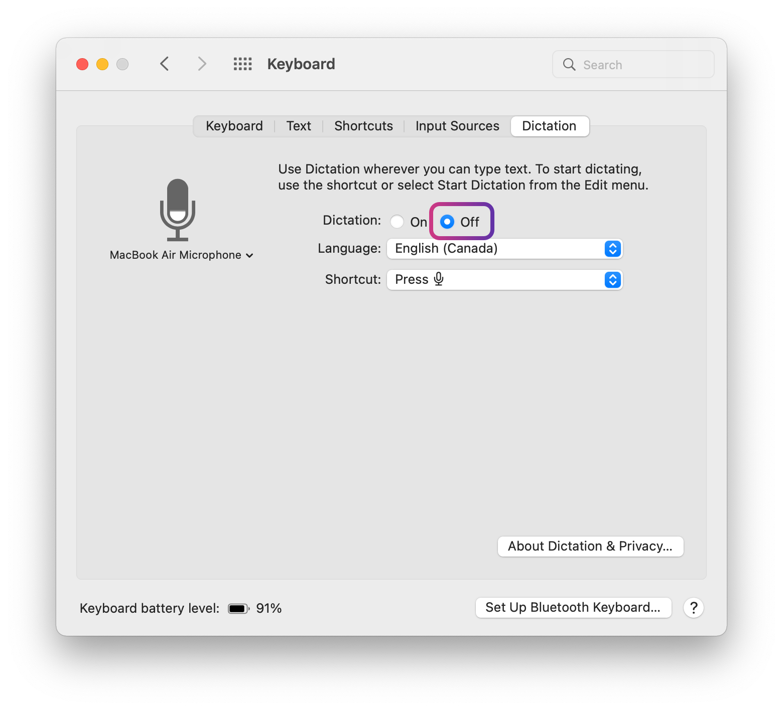 การเขียนตามคำบอกแบบออฟไลน์บนอุปกรณ์ Apple มีขั้นตอนการทำงานโดยจะดาวน์โหลดไฟล์ลงในอุปกรณ์ ถ้าหากว่าเราไม่ได้ใช้คุณสมบัตินี้ ก็สามารถปิดการใช้งาน เพื่อเพิ่มพื้นที่ว่างบนเครื่อง Mac ได้โดยไปที่ การตั้งค่า > Keyboard > Dictation แล้วปิด