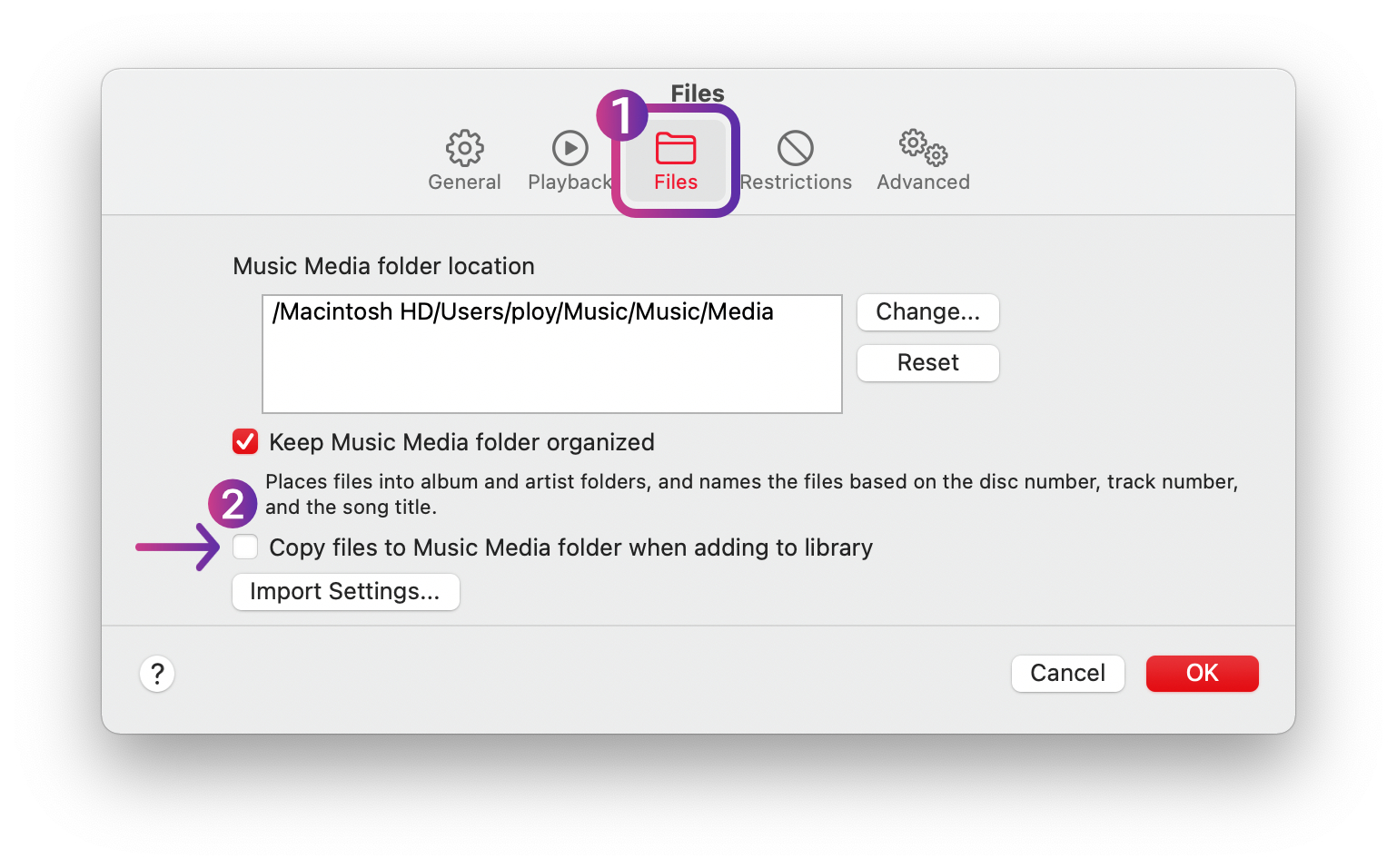 เมื่อเราเปิดเพลงที่จัดเก็บไว้ในโฟลเดอร์ (Finder) ในแอปเพลงหรือ iTunes เพลงนั้นจะถูกคัดลอกไฟล์ไปยังโฟลเดอร์ของตัวเอง ซึ่งหมายความว่าเพลงเดียวกันจะถูกบันทึกสองครั้งลงบนเครื่อง Mac ทำให้กินพื้นที่จัดเก็บบนเครื่อง Mac ดังนั้น เราสามารถตั้งค่าป้องกันไม่ให้แอปเพลงของ Mac หรือ iTunes สร้างเพลลิสต์เพลงซ้ำกัน ทำได้ดังนี้
