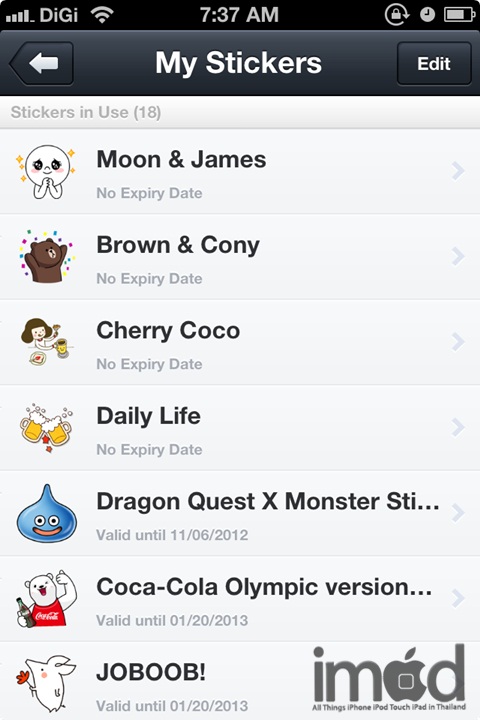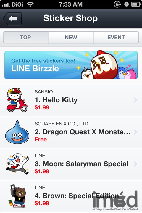 ขั้นที่ 6: สำราญ! ต่อไปให้ ไป ที่ Sticker Shop ครับจะมี Sticker Japan ฟรีทุกตัวให้โหลด จัดการได้เลย มาครบครับทั้ง ใหม่ล่าสุดอย่าง Dragon Quest X, Coca Cola ,Spider Man, Recruit, Lawson, Nissin Foodอ่อ Sicker ที่ได้รับ Gift มาก็ยังอยู่นะครับ หากใช้ Line ID เดิมที่เคย Register Email เอาไว้ ทั้ง Sticker อุ่นใจ Singtel และ Hi !!