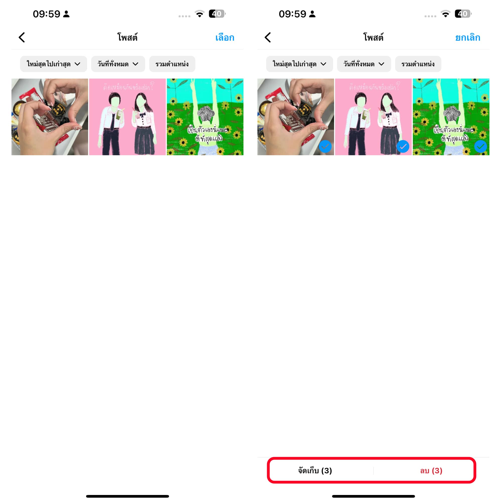 จากนั้นเลือกโพสต์ที่ต้องการจัดเก็บหรือลบได้เลยนะ เลือกได้หลายรูปด้วยสะดวกสุด ๆ