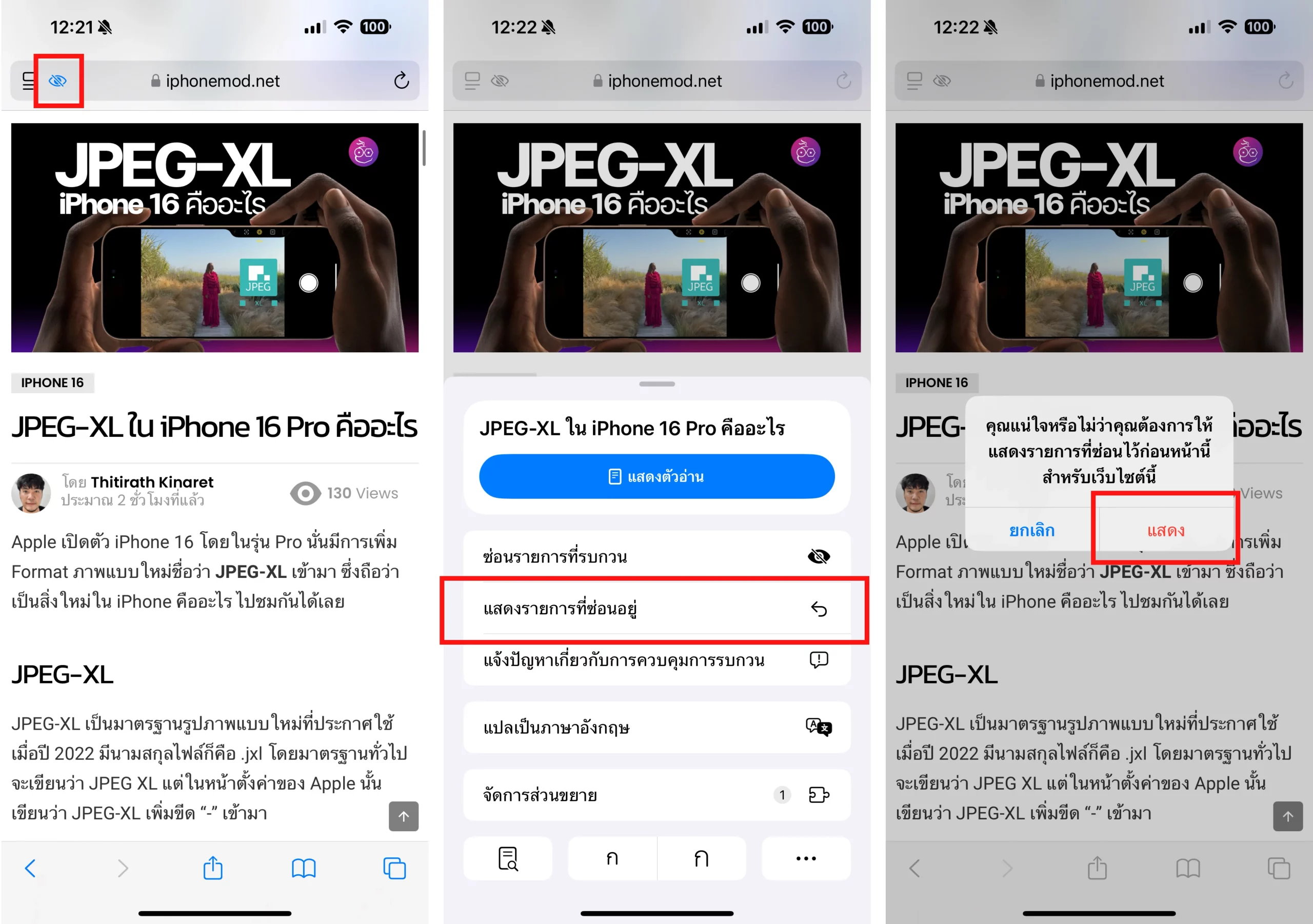 แตะไอคอนรูปดวงตา ในช่อง URL > แตะ “แสดงรายการที่ซ่อนอยู่” > แตะ “แสดง”