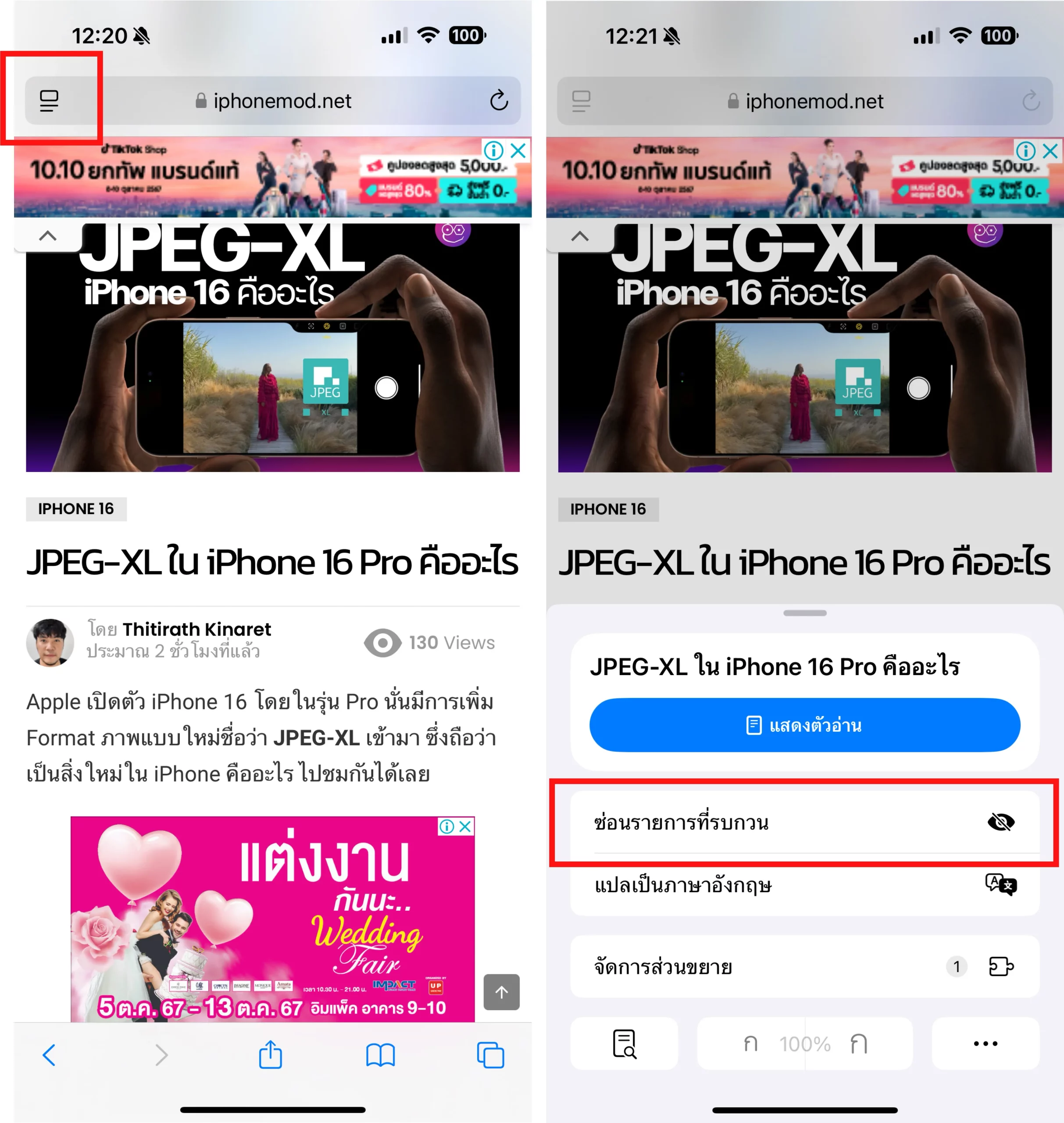เปิดแอป Safari > เข้าเว็บที่ต้องการ > แตะไอคอนในช่อง URL > แตะ “ซ่อนรายการที่รบกวน”
